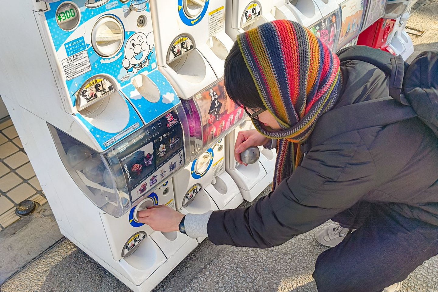 東京では売り切れていたガンダムのガチャガチャを見つけ、嬉々としてまわす小椋くん。