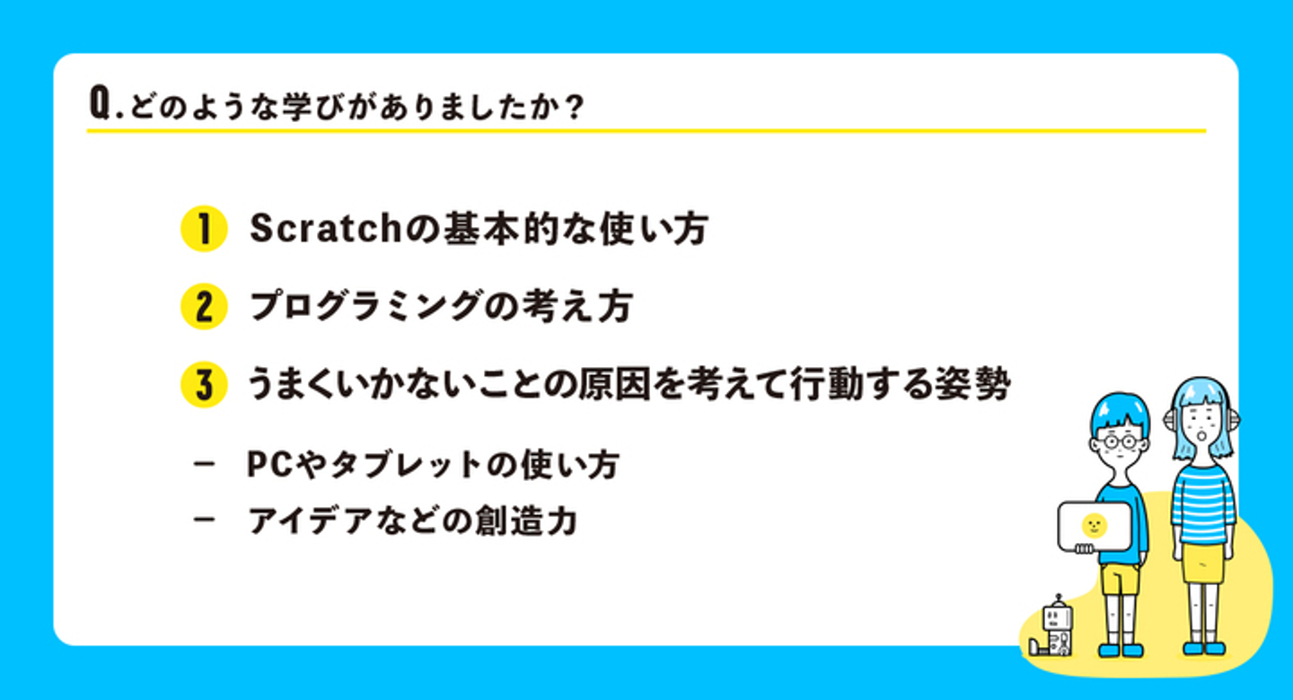 オンラインでのプログラミング学習を通じて学んだことは「Scratchの基本的な使い方」が最多で「プログラミングの考え方」、「うまくいかないことの原因を考えて行動する姿勢」であったことがわかりました。