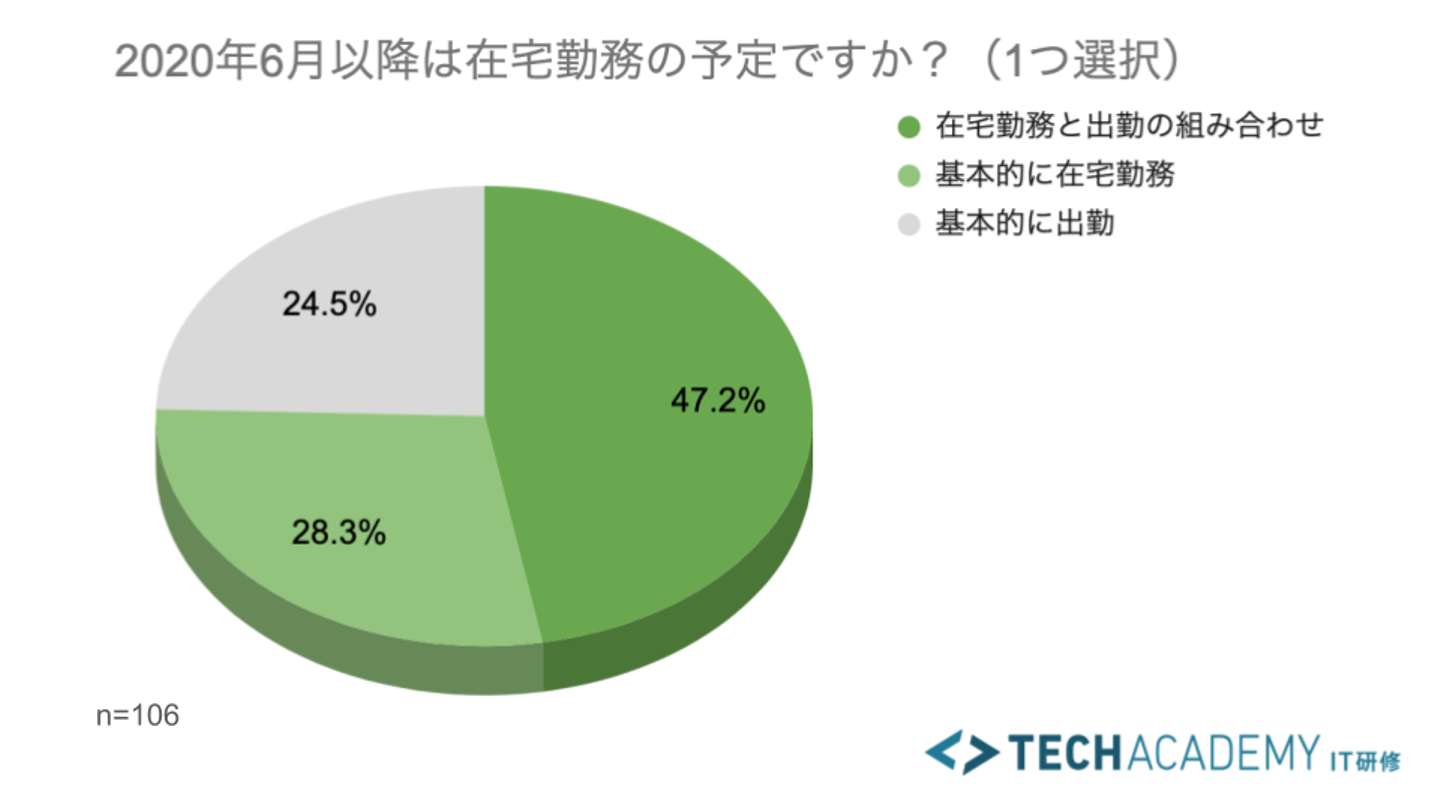 「2020年6月以降は在宅勤務の予定ですか?」という問いに対し、全体の47.2%の人が「在宅勤務と出勤の組み合わせ」、28.3%の人が「基本的に在宅勤務」と回答しました。