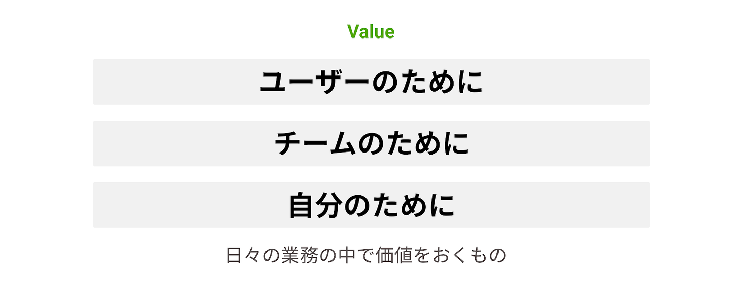 ここまでで読んでいただき、私たちの目指す方向や取り組み方を理解していただけたと思います。最後はそれを私たちが実現するために、日々意識している3つのバリューについてお話したいと思います。