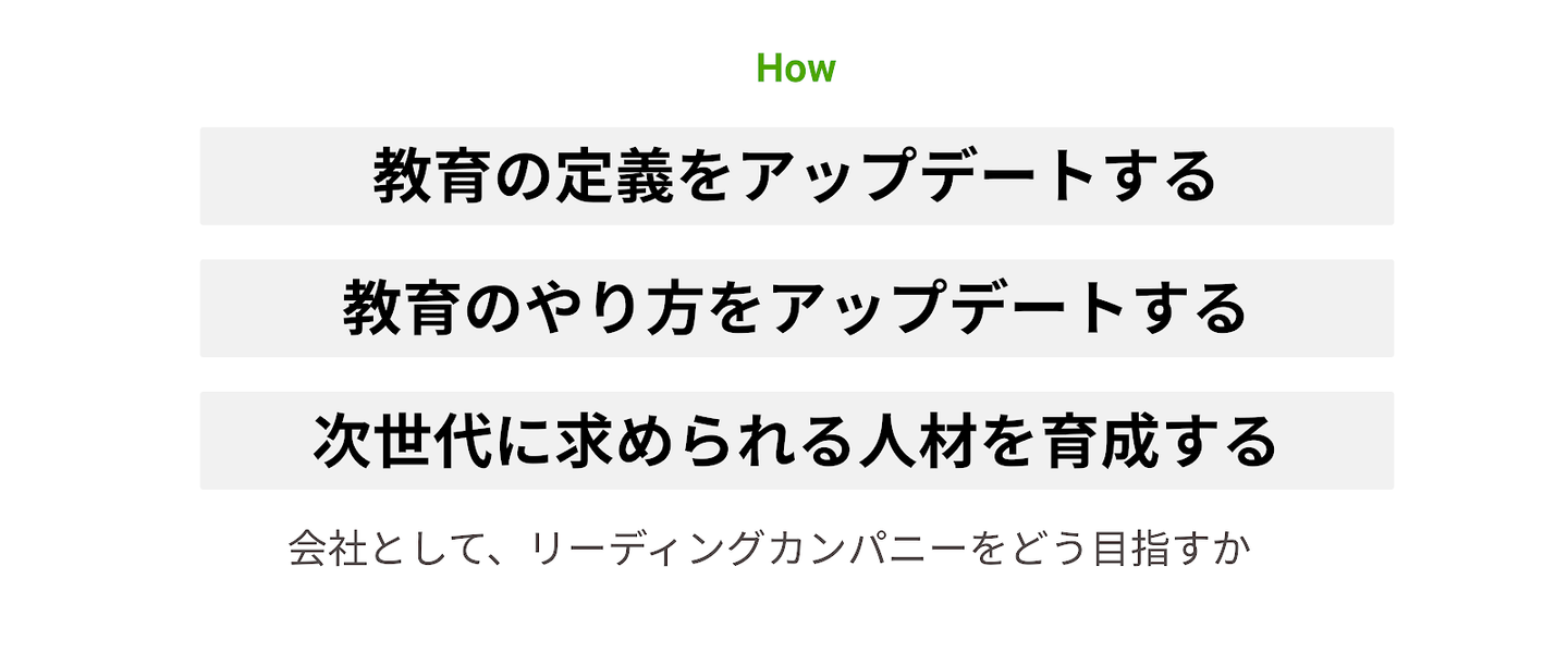 では、私たちはどうやって「自己実現を最大化」して「次世代の教育のリーディングカンパニー」になるのか? 3つの軸で考えています。
