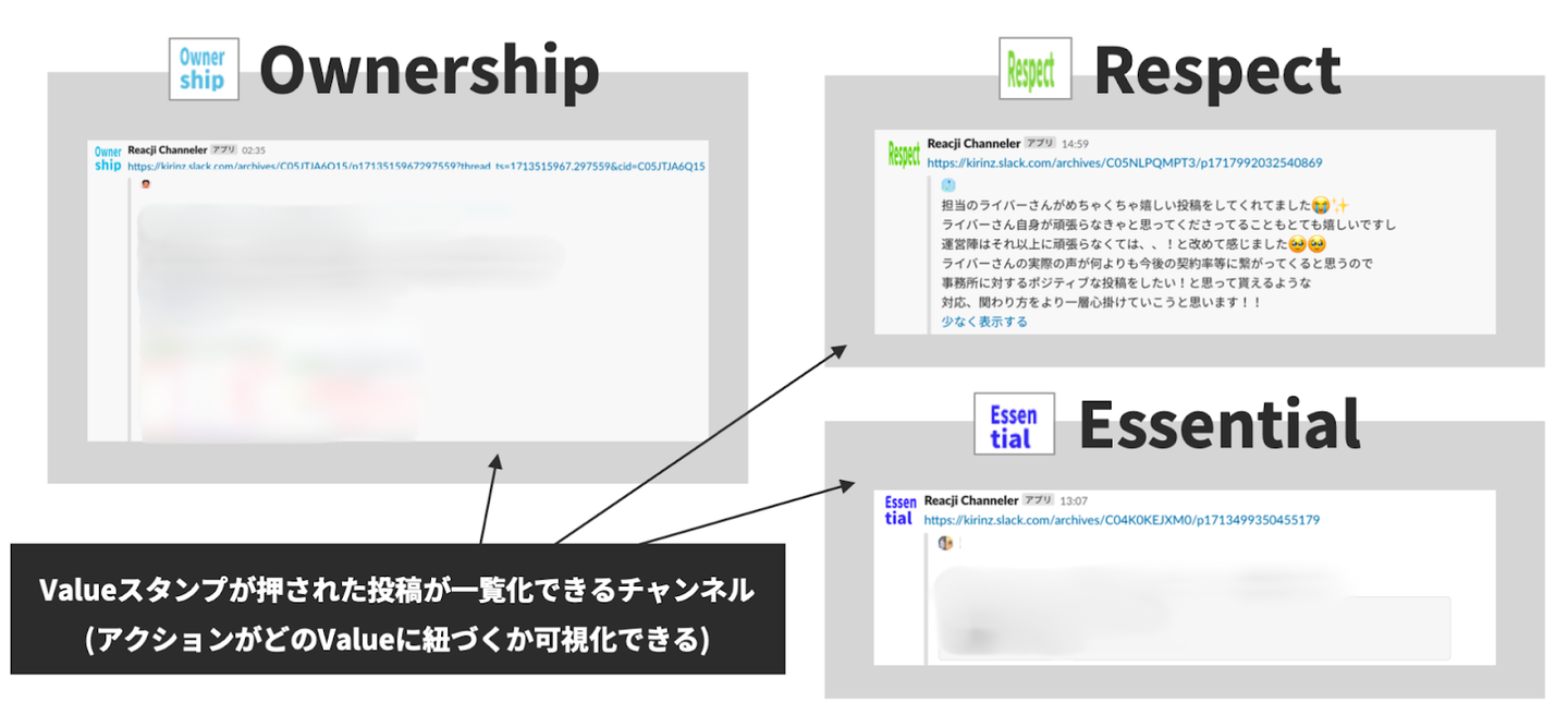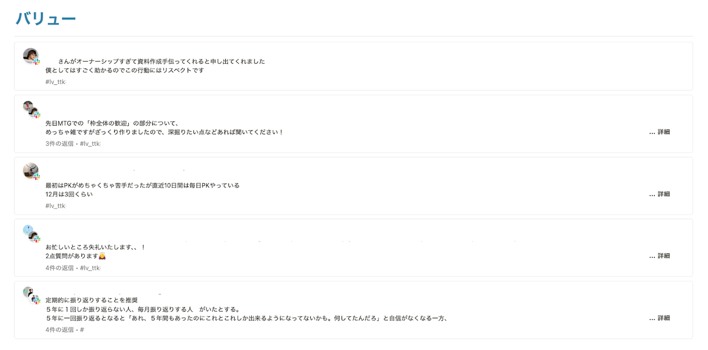 Slackの投稿は、毎週月曜の全社朝礼で各事業部長が“バリューを体現する行動”として紹介。業務での行動がバリューとつながっている意識を醸成するとともに、バリューを体現した際に賞賛し合うカルチャーが根づくことで、業務のモチベーションが高まりました。