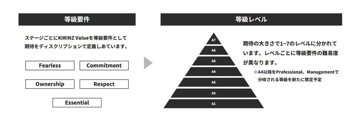 KIRINZでは、人事評価制度の行動評価項目に『FORCE』を含めています。例えば【Fearless / 挑戦】は「大胆な挑戦」、【Ownership / 牽引】は「理想を掲げる」「動かす」、【Respect / 尊重】と【Commitment / やり切る】は「素直さ」「真面目さ」「協調性」「やり切る」、【Essential / 本質】は「戦略策定」「PDCA(分解/分析)」と要素をさらに分解し、バリューを体現しているメンバーを評価しています。
