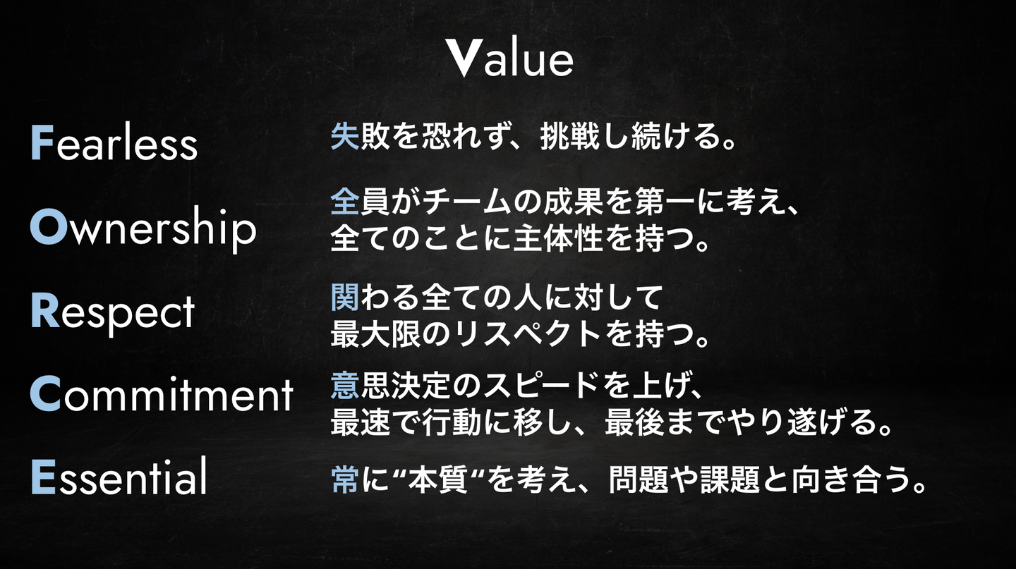 チームでの挑戦には素直さや協調性が求められ、チーム単位で物事を考え人を動かすには他者へのリスペクトが欠かせません。「素直さ」「真面目さ」「協調性」など、『FORCE』の各項目をさらに細分化することでよりバリューを体現し、ミッションやビジョンの実現に近づきます。