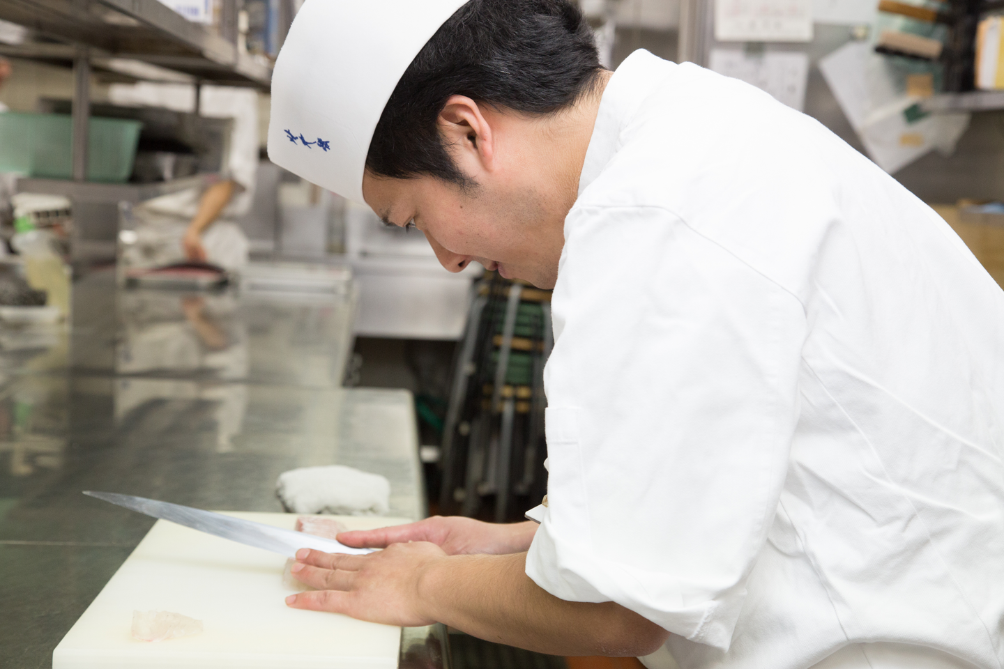 北大路には普通の店になかなかいないような技術を持ってる職人さんも多いので、そういうのを見ながら学べるという本当に面白いです。そういう方の仕事は何をやっても早くてキレイで見ているだけで勉強になります。料理というと味付けばかりを磨いていると思われることもありますが、見た目を決める包丁技術ひとつとっても学ぶことは多いです。切り方ひとつで食材にツヤが出て、長持ちまでするので」