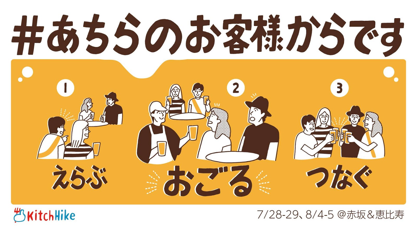 内容はこんな感じ。全く知らない人からおごられる→今度は自分おごる側に回る→おごりが連鎖していく。その本質は、「食でつながる、プチ・キッチハイク体験」が広がるというものです。しかも代金はキッチハイクが持つというシステム。よなよなビアガーデン・ビアワークス(運営:株式会社ワンダーテーブル)と手を組んで実施しました。