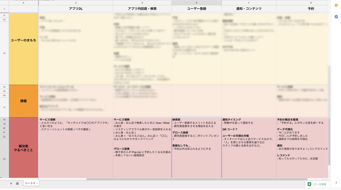 藤崎とカスタマージャーニーを見ながら、リニューアルで大事にすべきことは何か、もう一度整理をしました。キッチハイク体験をユーザーさんに楽しんでもらうためには、予約をしてもらう必要があります。でも、キッチハイクは「知らない人とみんなでごはんを食べる」という今までにないサービス。いかに 納得感 をもってアプリを使ってもらえるかが大事なのでは?という結論が出ました。ずっと決めたかったコンセプトのキーワードとして「納得感」というワードが出てきたのです。実は、シートの中にもこのキーワードが書いてあります。答えはそこにあったんですよね。