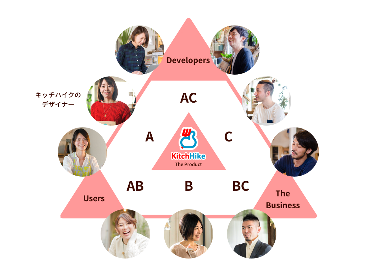 (上記写真*) プロダクトマネジメントトライアングル にキッチハイクチームを当てはめる