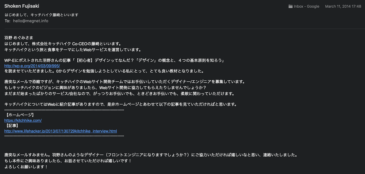 運命の出会いが到来 1日で PV が1万超え、はてブ900超え!からの突然のメール 当初は、就職活動でどうして良いかわからないからという理由で休学をしていたのですが、振り返れば休学しなければ今の自分がいなかったと思うと、不思議な縁を感じます。