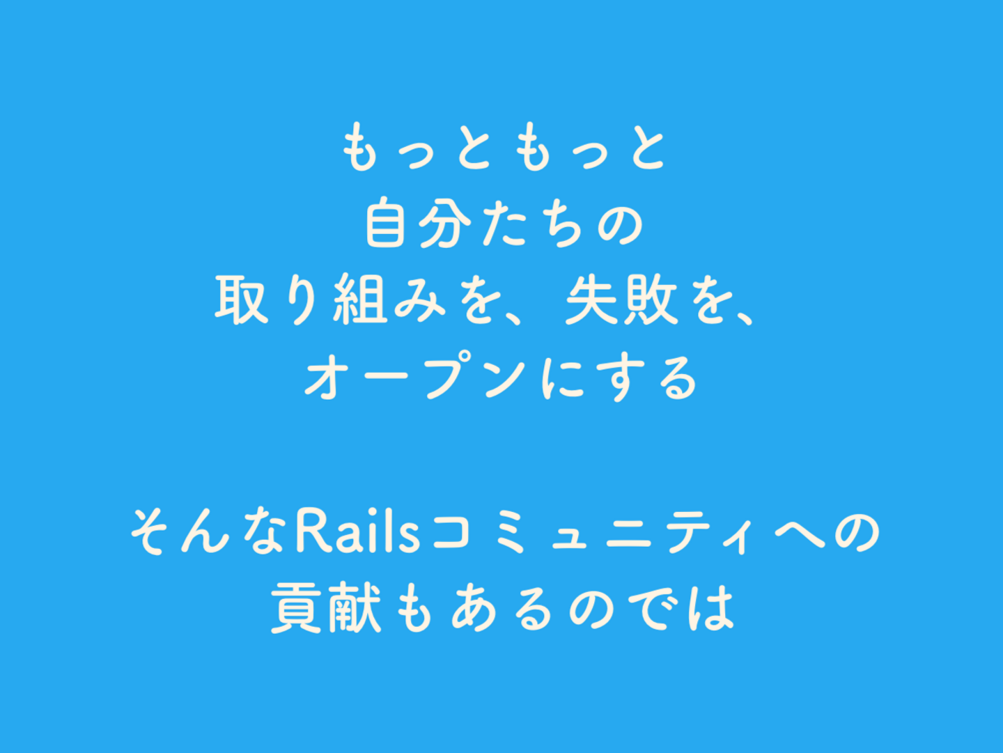 一般的には失敗例を社外に公開するメリットはそんなにありません。ですが、Railsの開発コミュニティに現場の知見・失敗を共有することで、コミュニティ全体に良い影響を与えるというのが小川の考えです。