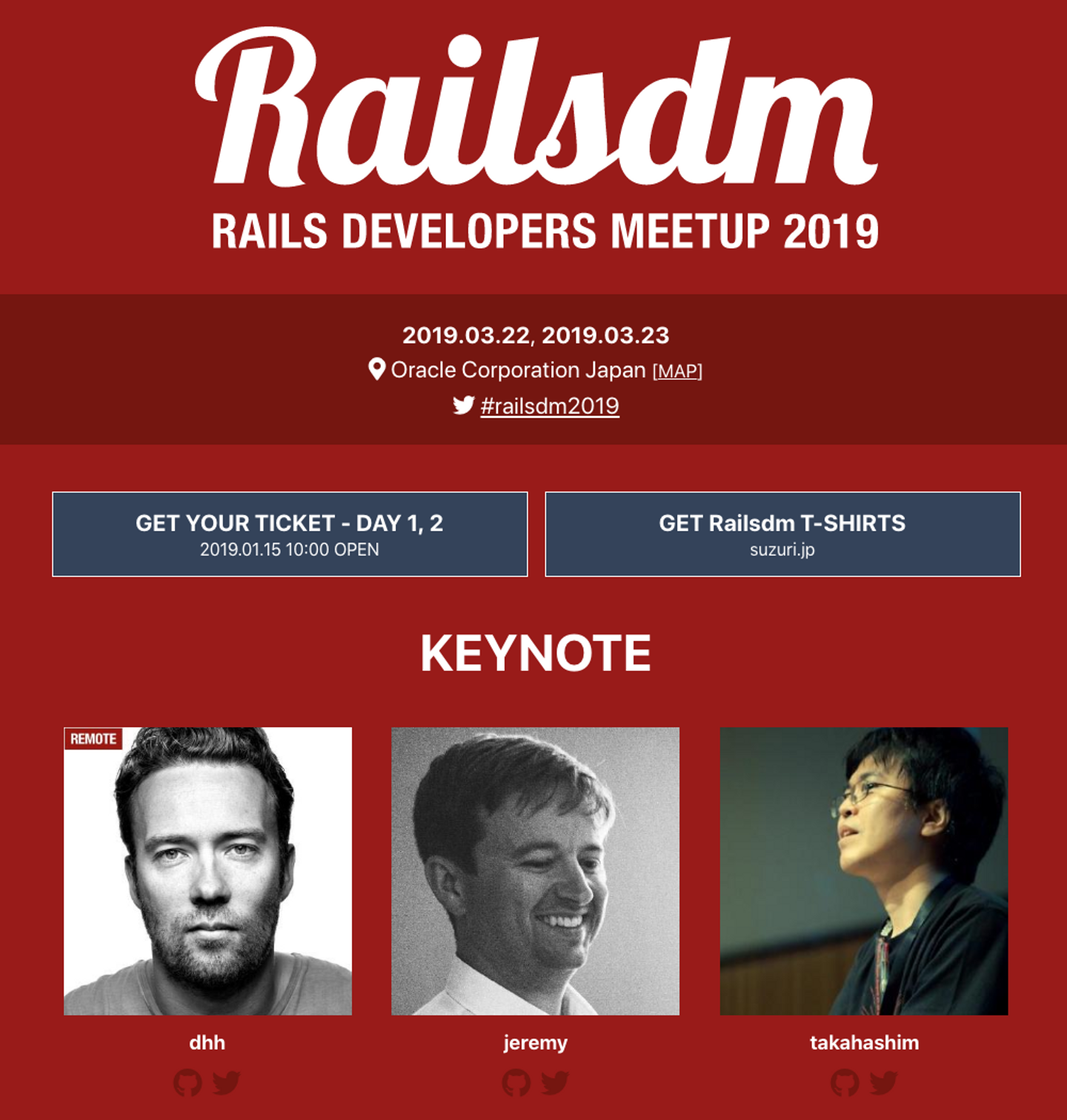 今回のRailsDMのキーノート(基調講演)は、なんとRuby on Railsを作った本人であるDHHことDavid Heinemeier Hansson!リモートからオンラインで登壇されました。他にもRailsの開発に初期から関わっているJeremyや日本Rubyの会代表理事 高橋 征義さんの講演がありました。