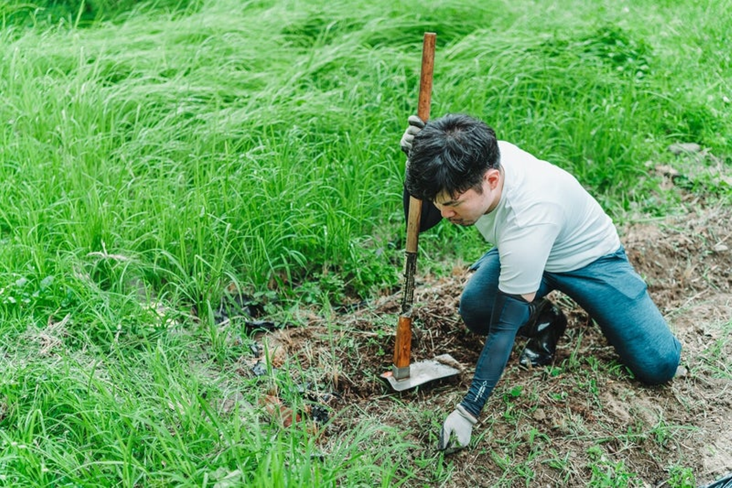 今まで使っていなかった土地なので、雑草だらけのやせ細った土地だったんです。農業用の土を買ってきてもよかったのですが「何でも、やってみる」信条を思い出し、自分で開墾してみることにしました。草刈りをして鍬で土を掘り起こしていくとても地味な作業です。これが気が遠くなるほど大変な作業で、友人に手伝ってくれないかと声をかけました。少しずつ友人たちが集まってくれて人手が増えていき、順調に開墾が進みました。でも、それよりも良い気付きになったのが、友人の友人、さらにその友人と開墾作業を通じて人の輪がどんどん広がっていったことです。