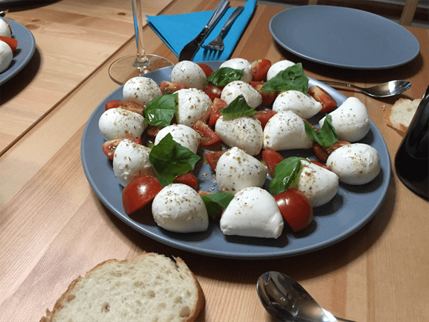 テーブルの上には水牛のモッツアレラチーズを使ったカプレーゼ。