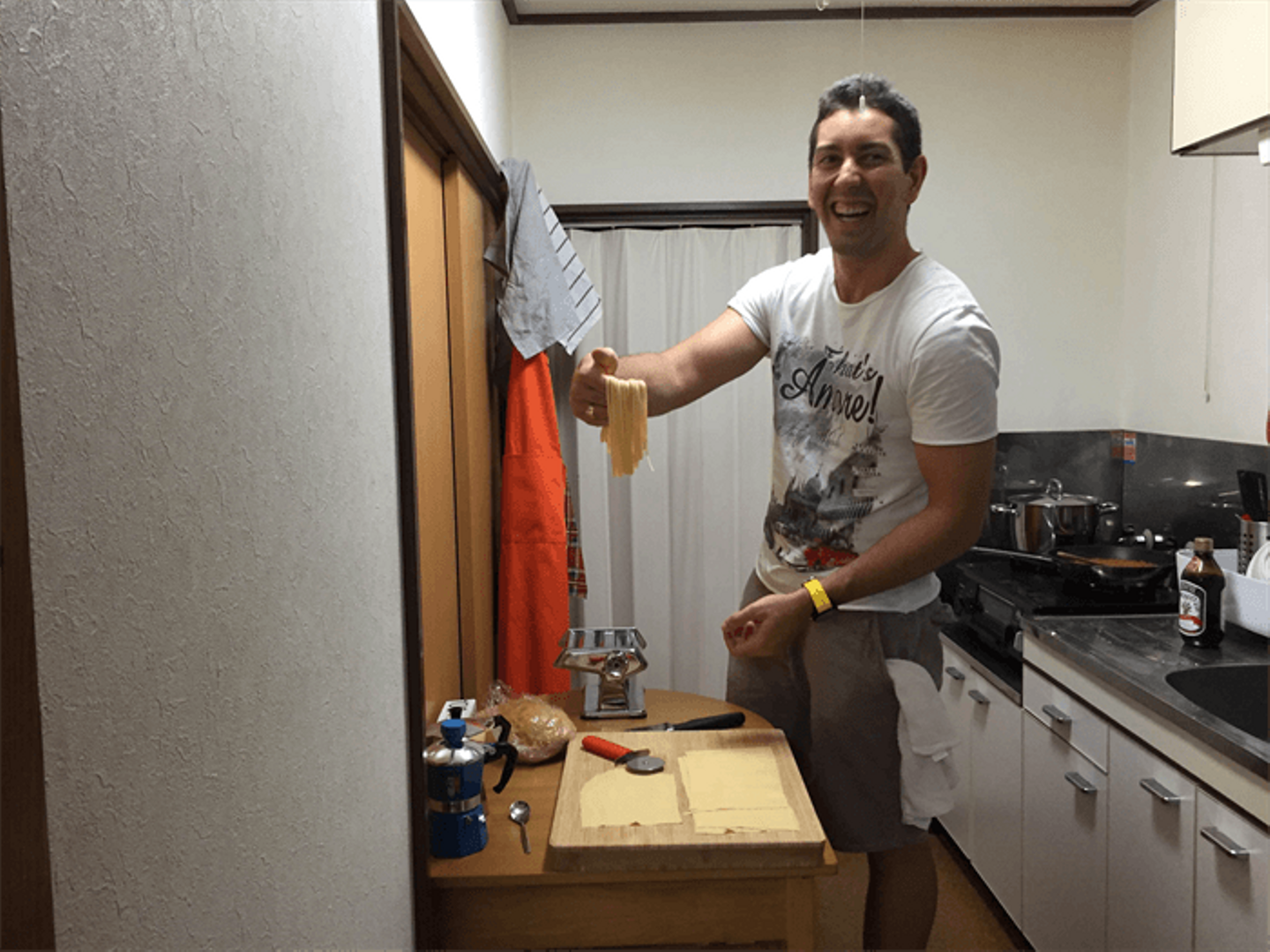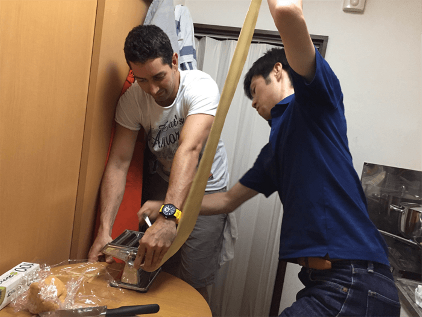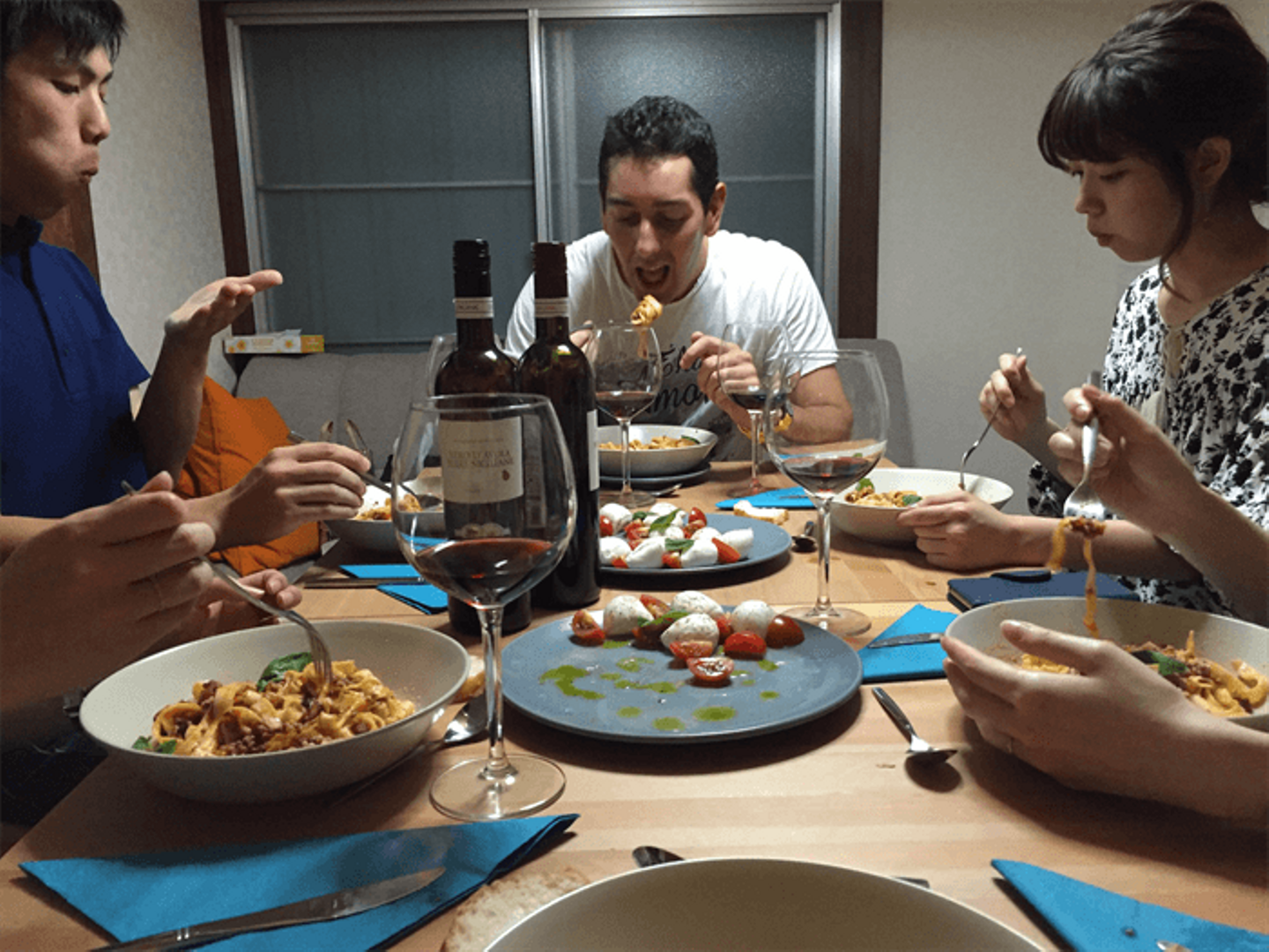 みんなでお喋りしながら食事をしていると、「パスタの準備をするけど、みんなは食事を続けててね!」とアレッサンドロさんはおもむろにキッチンへ。そうは言われたものの、みんな気になってキッチンを覗きに行きます(笑)。