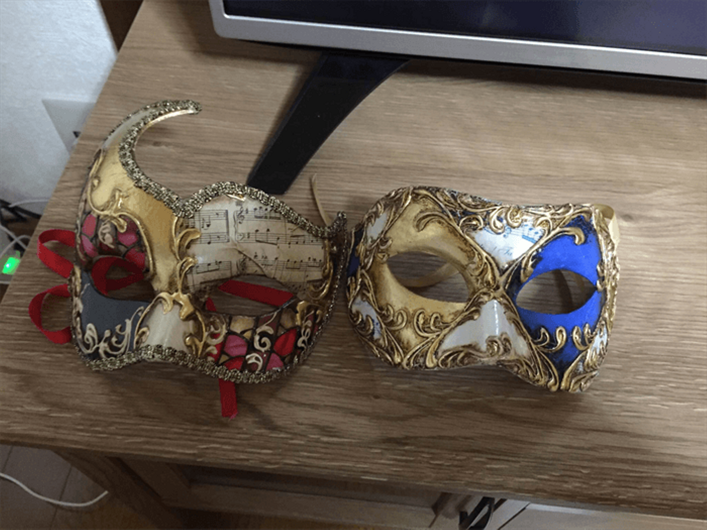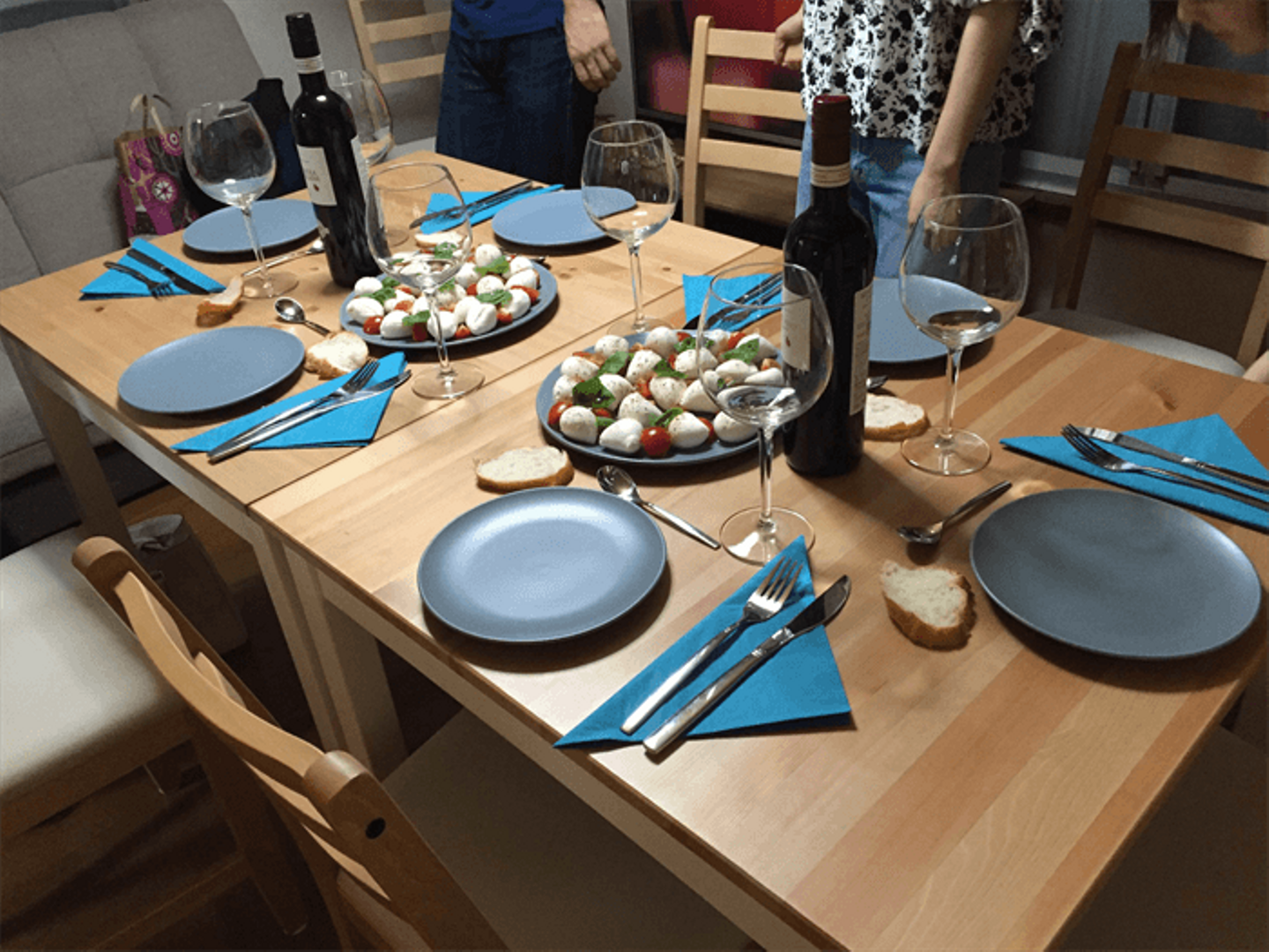 中に入ると、既にテーブルセッティングがされたお部屋に通してくれました。私たち以外にも3人の参加者がいて、アレッサンドロさん含め6人でテーブルを囲みます。アレッサンドロさんは、ヴェネツィア出身とのことで、テレビ台にはヴェネツィアの仮面が置いてありました。