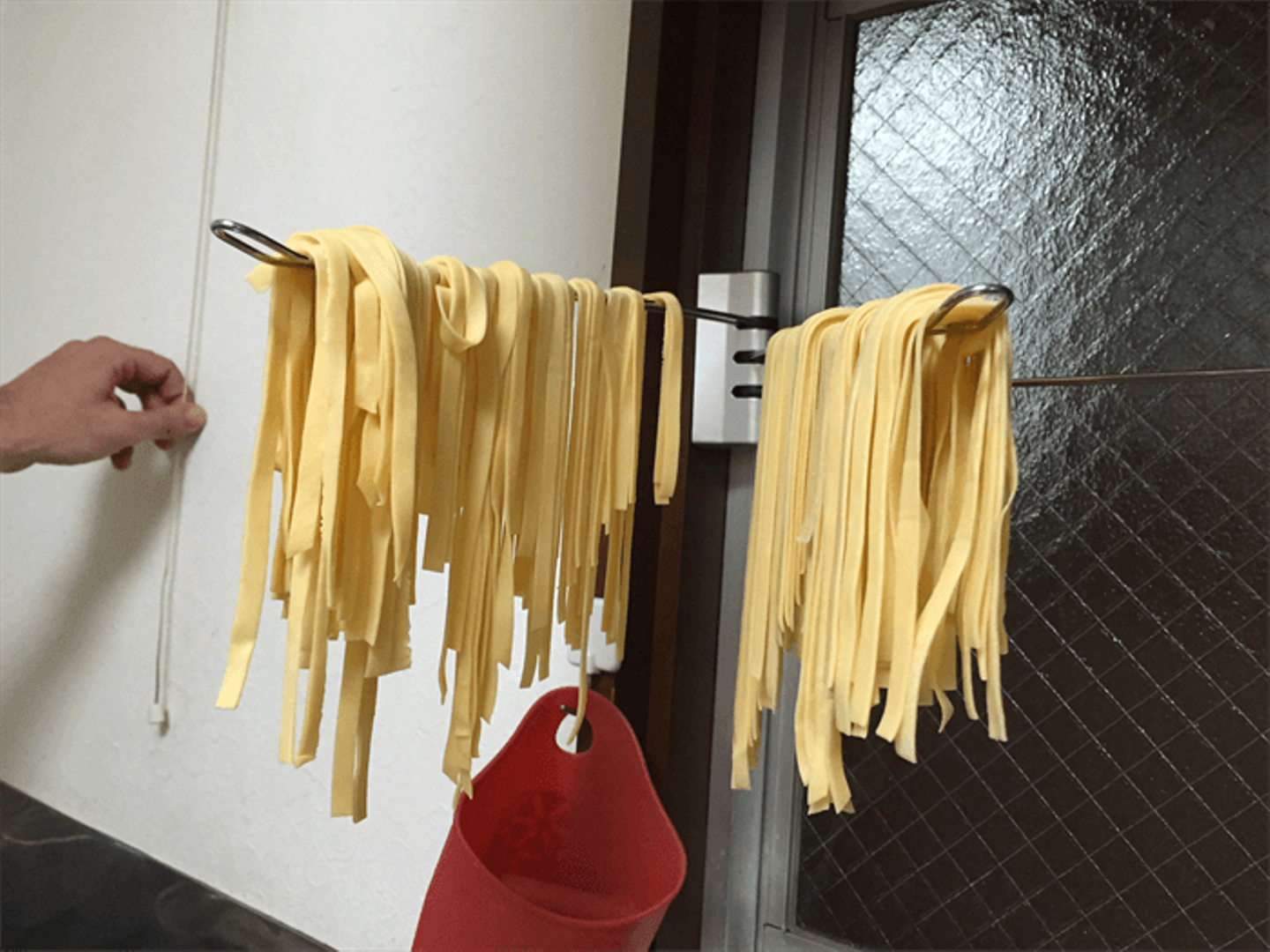 できた生パスタは布巾かけハンガーにかけます。こんなところにパスタをかけるとは……。奇妙な光景に、参加者一同思わず写真をパシャリ (笑)。でも、このハンガーは、布巾ではなくパスタ専用なんです。