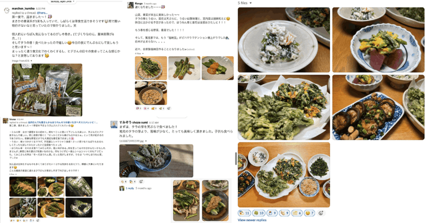 もともと料理は食べる専門でしたが、キッチハイクと関わり出してから興味をもってつくるようにもなりました。キッチハイクには、「同じ畑の飯を食おう」という福利厚生があって、月1回応援地域を決めて、その土地の食材を家に届けてみんなで味わう企画があります。知らなかった地域の食材が届くのが毎月すごく楽しみなんです。みんなが、その感想を社内のSlackに写真とともに上げていくのですが、キッチハイクメンバーの気づきや、食べ方も興味深くて、おもしろいんです。新しい料理方法も知ることができるので、自分でも試してみたりしています。