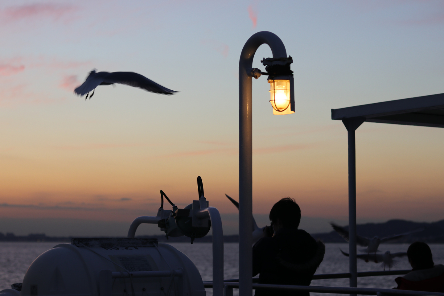 行きは電車で来ましたが、帰りはフェリーを使って久里浜経由で帰りました。金谷 -> 久里浜間のフェリーは約40分です。ちょうど夕焼けを見れる時間に乗れました。