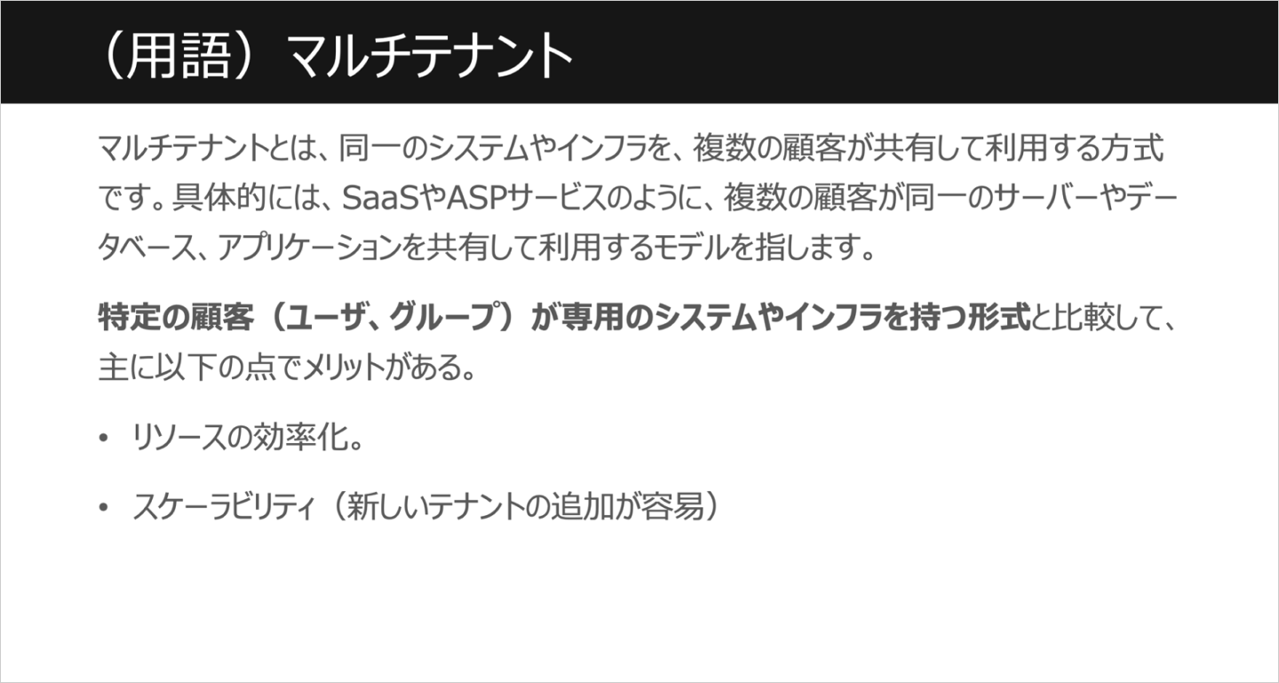 複数顧客が同一システムを共有利用する方式で、リソースの効率化と新規テナント追加の容易さが大きなメリットです。