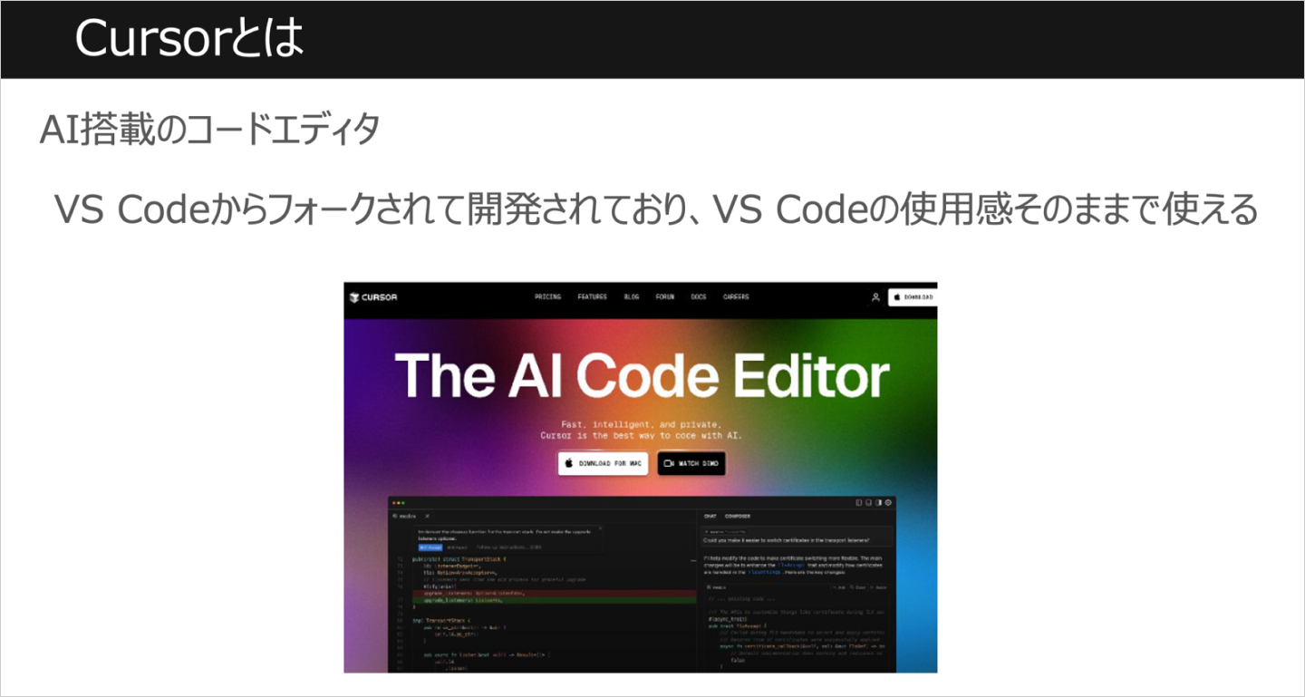 AI搭載のコードエディタ「Cursor」について、基本機能から実践的な活用法まで紹介いただきました。AIとの連携によって効率的にコード生成・レビュー・ドキュメント作成が可能になり、生成の実演まで行っていただきました。
