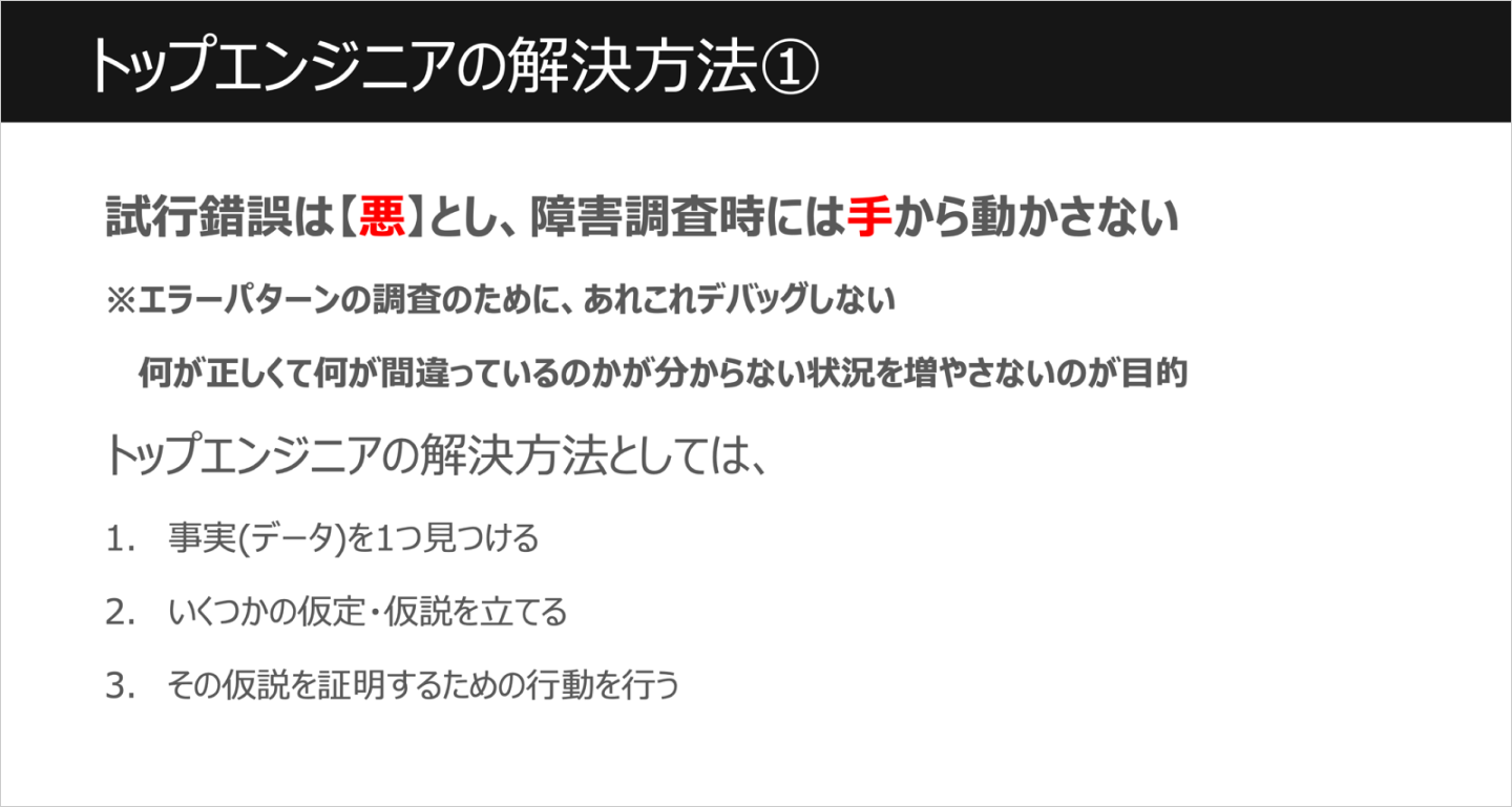 障害対応時には「まず手を動かさない」。システム全体を俯瞰し、事実を積み上げて原因を特定する。