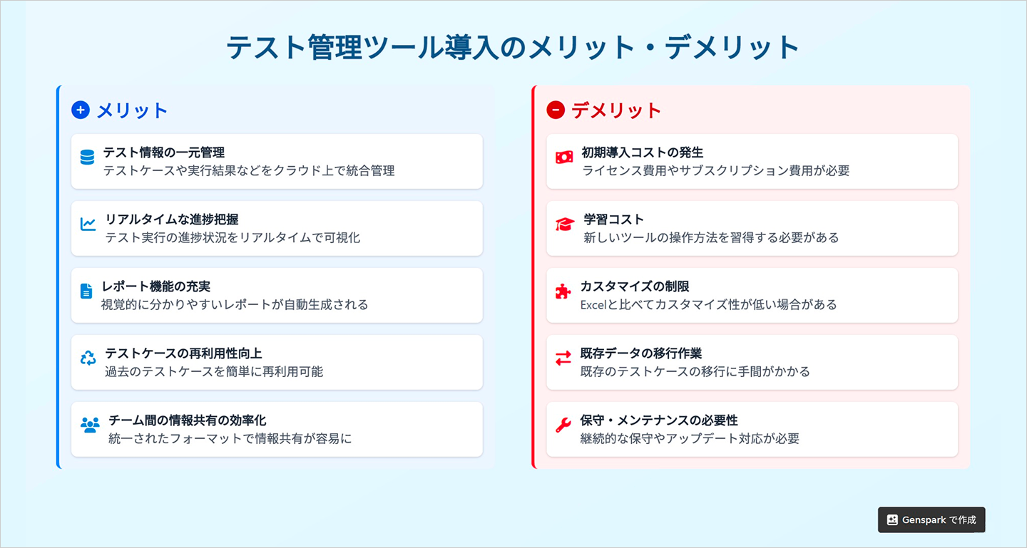 開発環境との親和性を重視し、Backlog連携やExcel互換機能の有無を確認する。また、生成AI機能があれば、テストケース作成の効率化が期待できる。