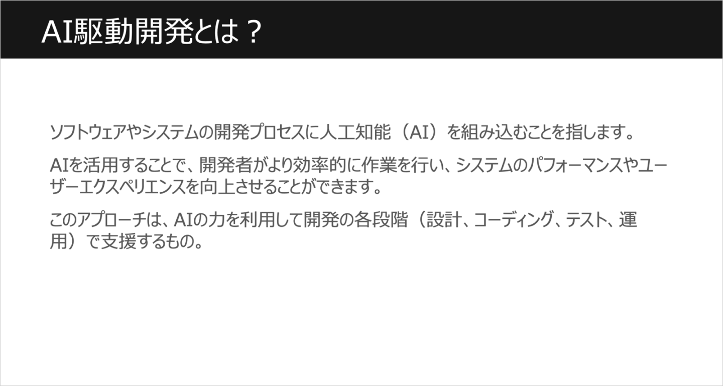 システム開発の各工程にAIを活用する「AI駆動開発」についての発表でした。コード補完や自動生成にとどまらず、テストケース作成やバグ予測、最適化まで幅広い領域でAIが利用できる可能性を紹介いただきました。