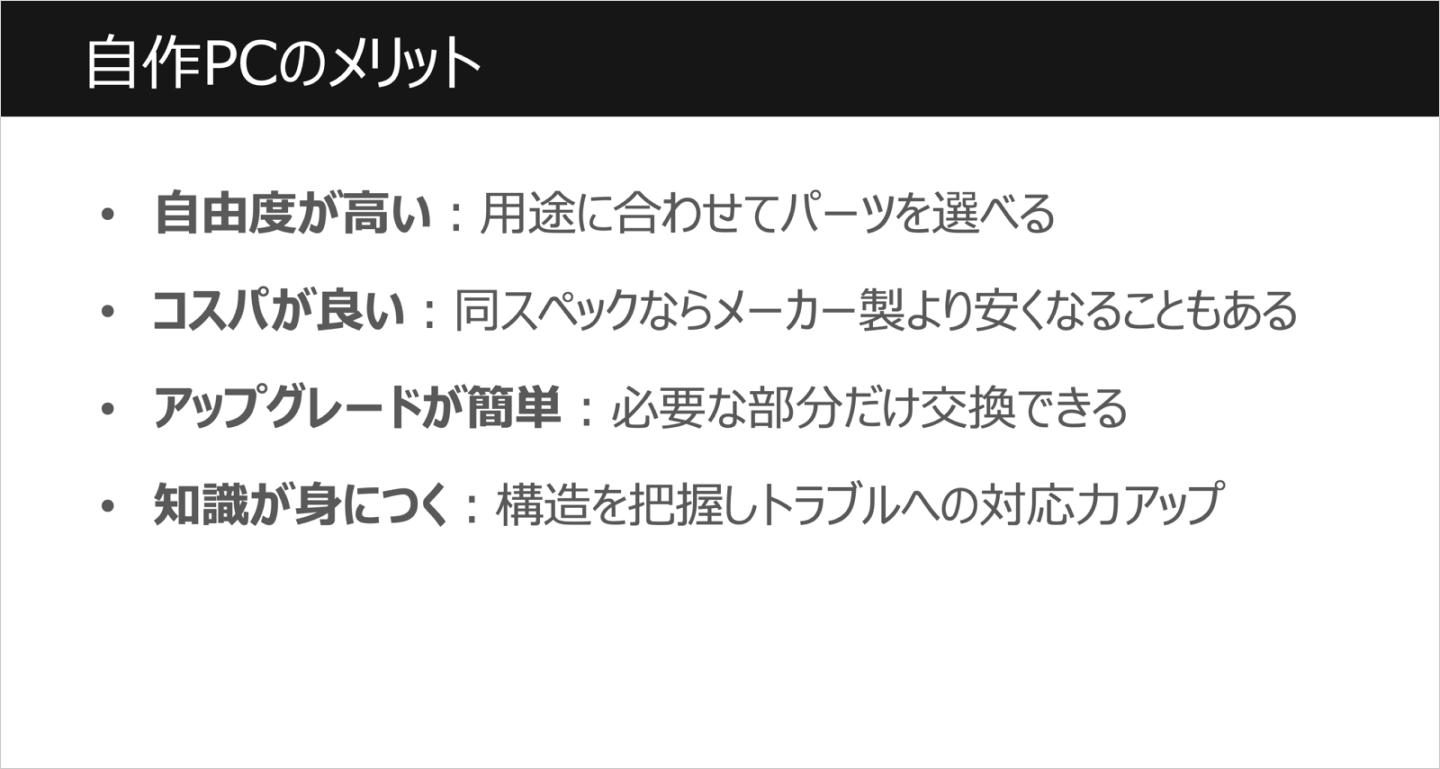 自作PCは「コスト・性能・愛着」の面で魅力があるが、リスク管理と何より知識が必要だなと思いました。相談サービスを活用しながら挑戦してみたいです。