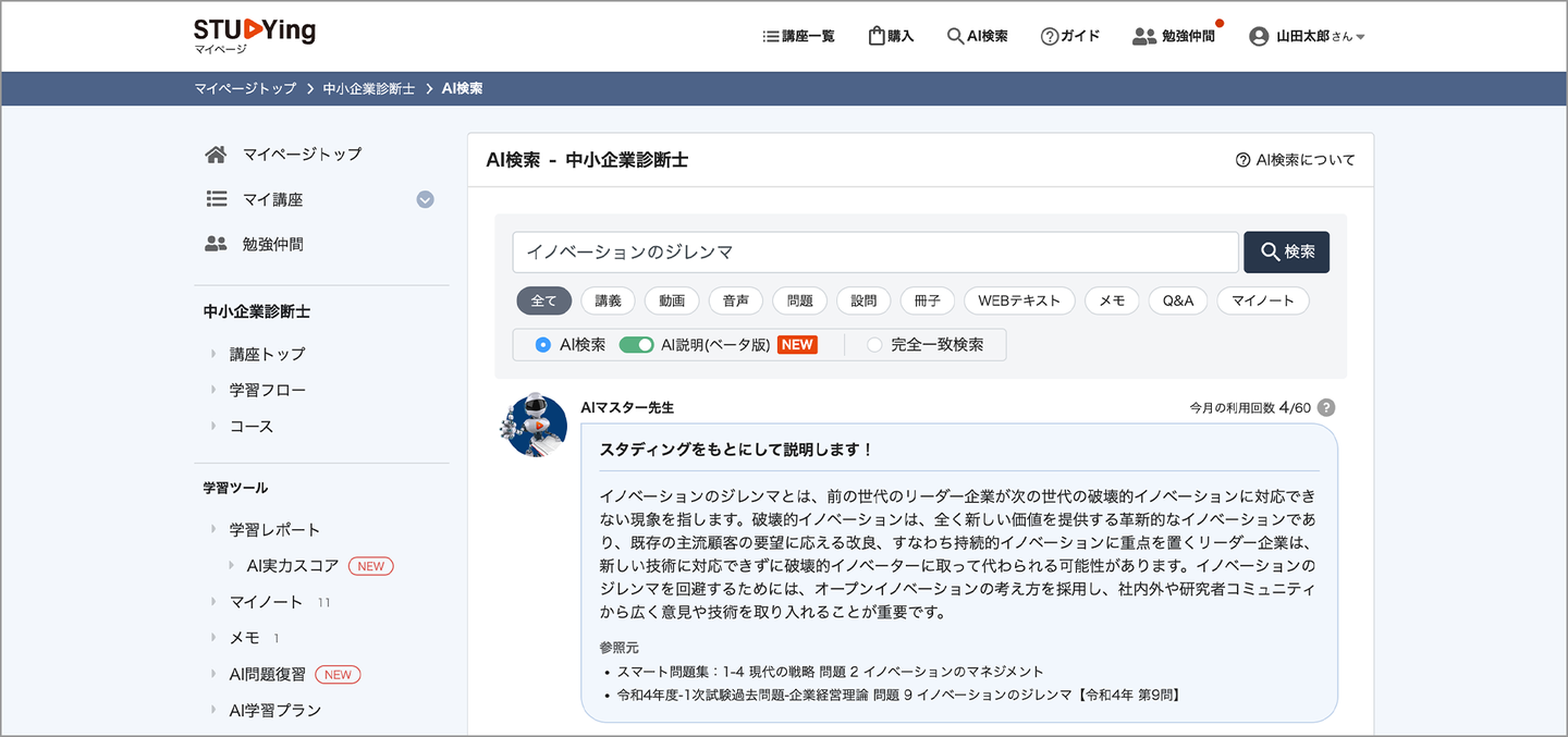 AI説明機能はAI検索に新たに搭載された機能で、ベータ版では有料コースを受講中の講座で利用できるようになっています。