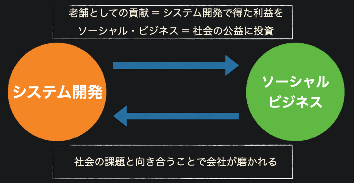 会社が得た利益を、社会の公益(ソーシャルビジネス)に投資をする。そこで得た経験をベースに既存ビジネスを変容させる。