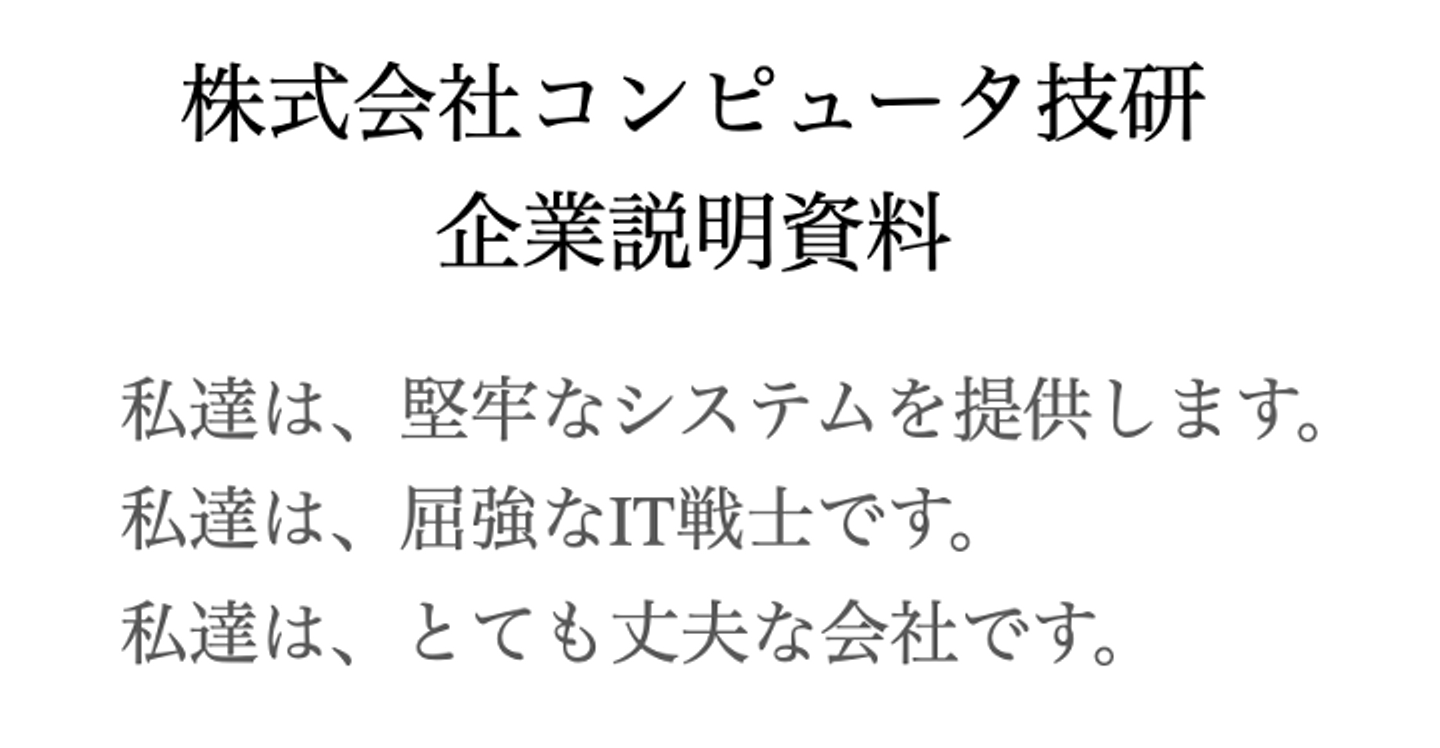 下のグレーの文字の部分は「コンピュータ技研」という社名を聞いて、みなさんが思い浮かべそうなイメージを記載しています。