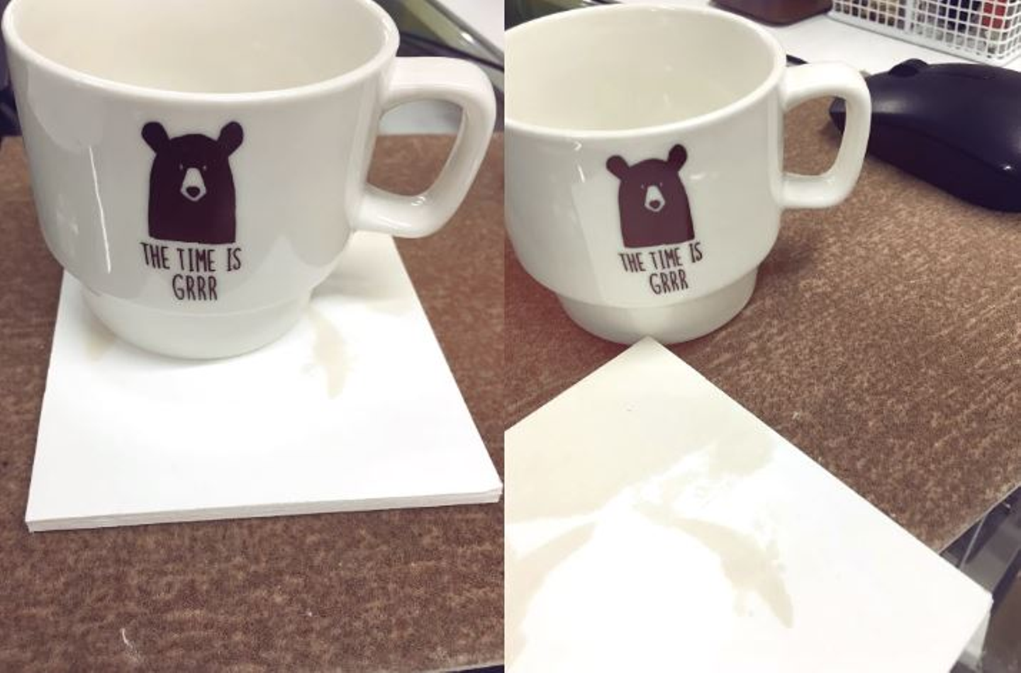 同僚からもらったマグカップのコースターが真っ白だったのが茶色のまだらになりました。悲!