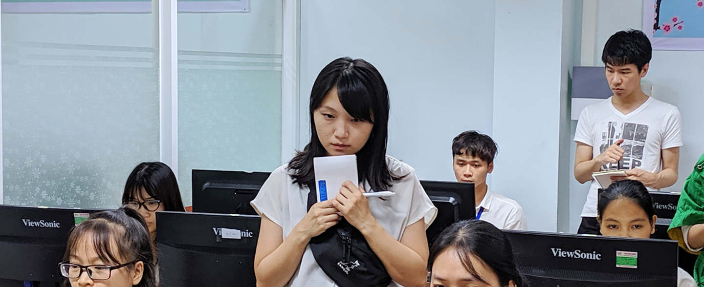 エンジニアの二人は、普段自分たちが作っている入力システムが、実際にベトナムでどのように使われているのかを初めて見ることになります。みなさんがどうやって入力作業を行っているのかを観察して、熱心に動画を撮影したりメモを取ったりしています。