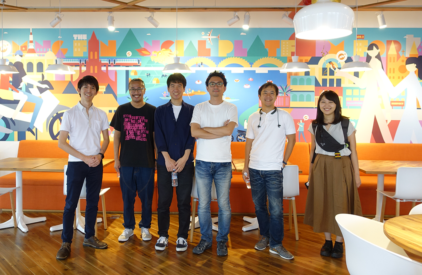 左から、萩野(エンジニア)、横井(CTO)、菅藤(CEO)、加藤(オペレーションマネージャー)、平嶋(エンジニア)、撮影している金井(広報)