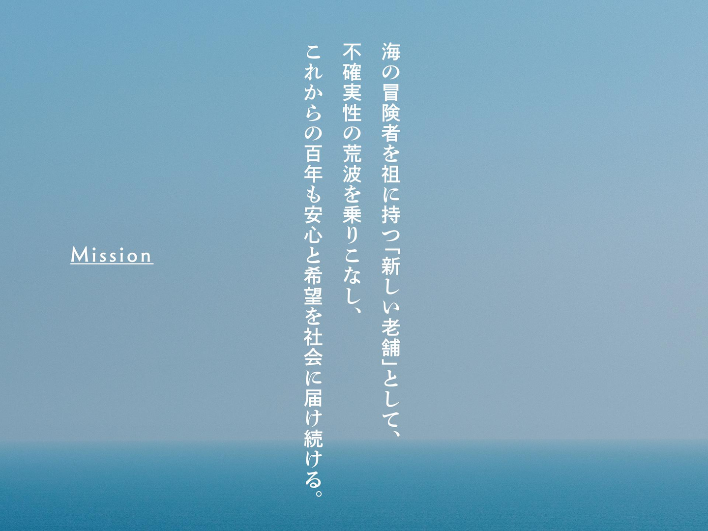 “Mission:海の冒険者を祖に持つ「新しい老舗」として、不確実性の荒波を乗りこなし、これからの百年も安心と希望を社会に届け続ける。”