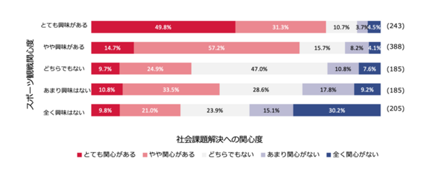 まず『スポーツ観戦関心度』がとても興味あると選んだ人は、『社会課題の解決への関心度』もとても興味があると選ぶ割合がなんと5割にも及んでいます。