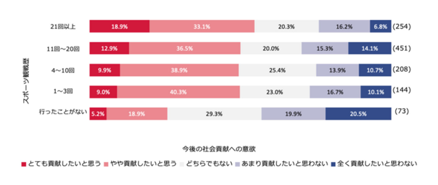 なので、実際に現地に行ってリアルでスポーツ観戦をした回数が多い人ほど、社会貢献活動への意欲が高くなるということなんですね!