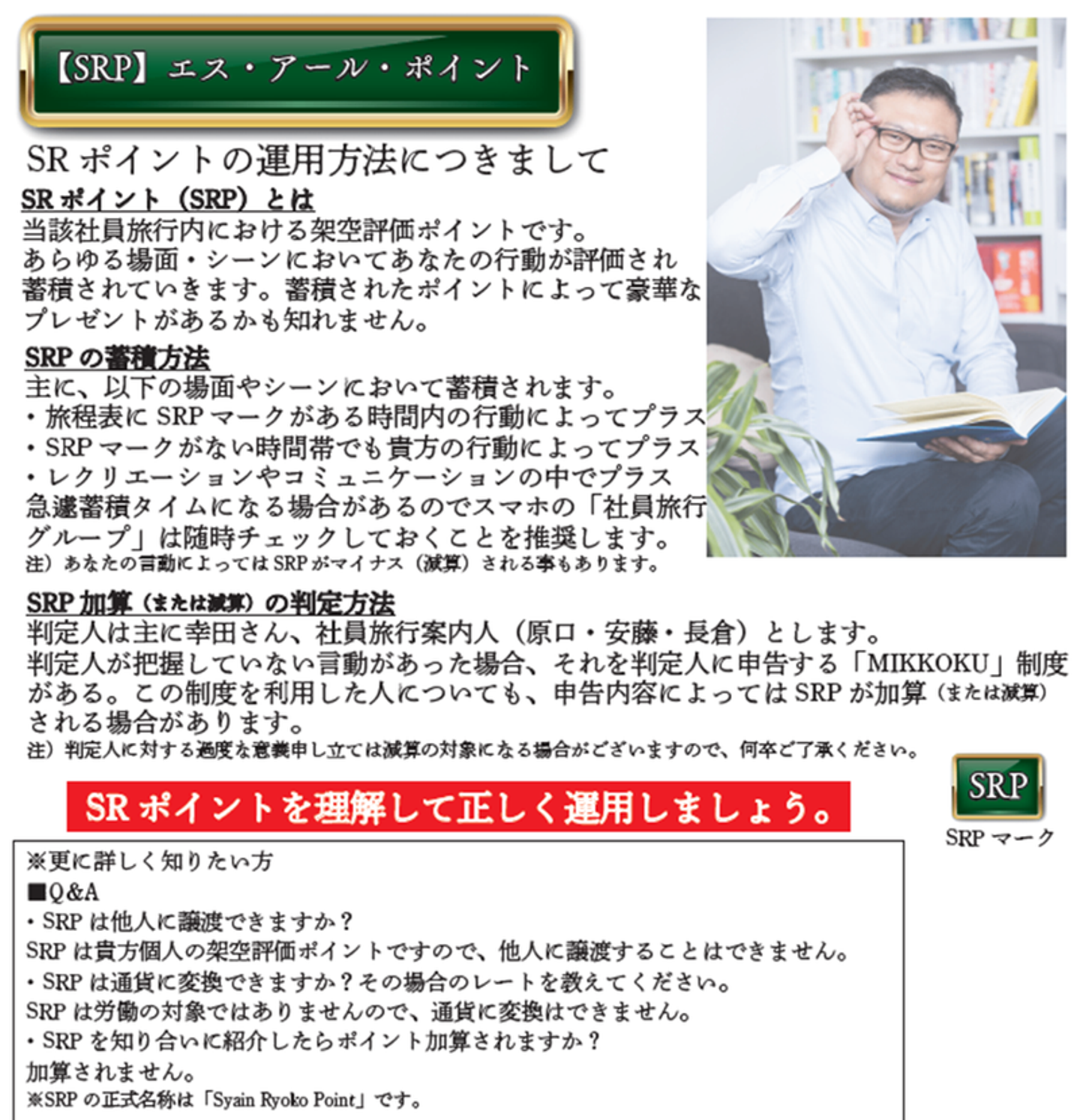 「社員旅行中にいい事をしたらポイントが加算される。大喜利の良回答や荷物を持ってくれたり・・とかでプラスされるが、内容によってはポイントがマイナスされてしまうこともあるので、密告制度なども取り入れてみよう。そして、このポイントをためるといい事がある。」