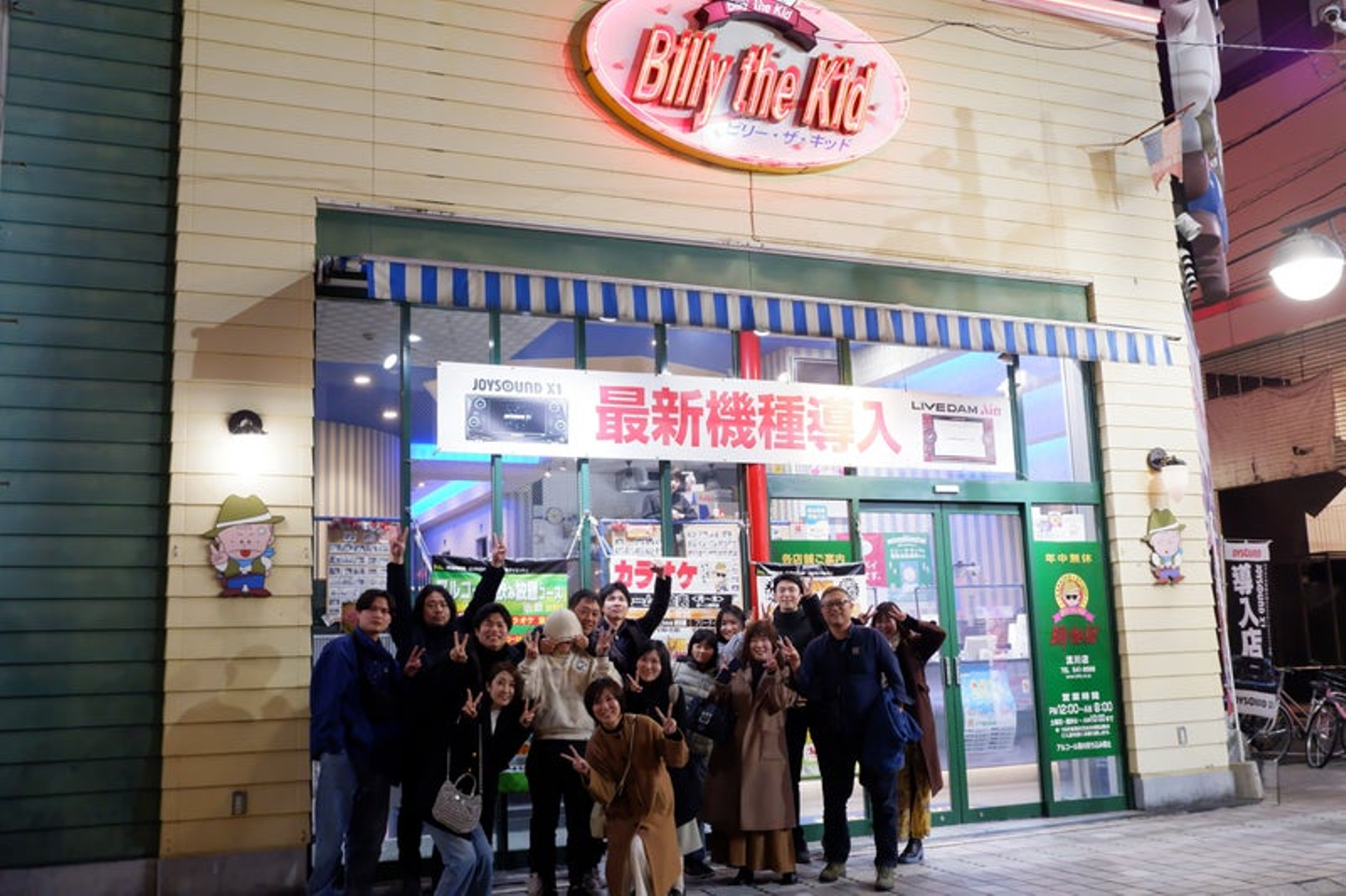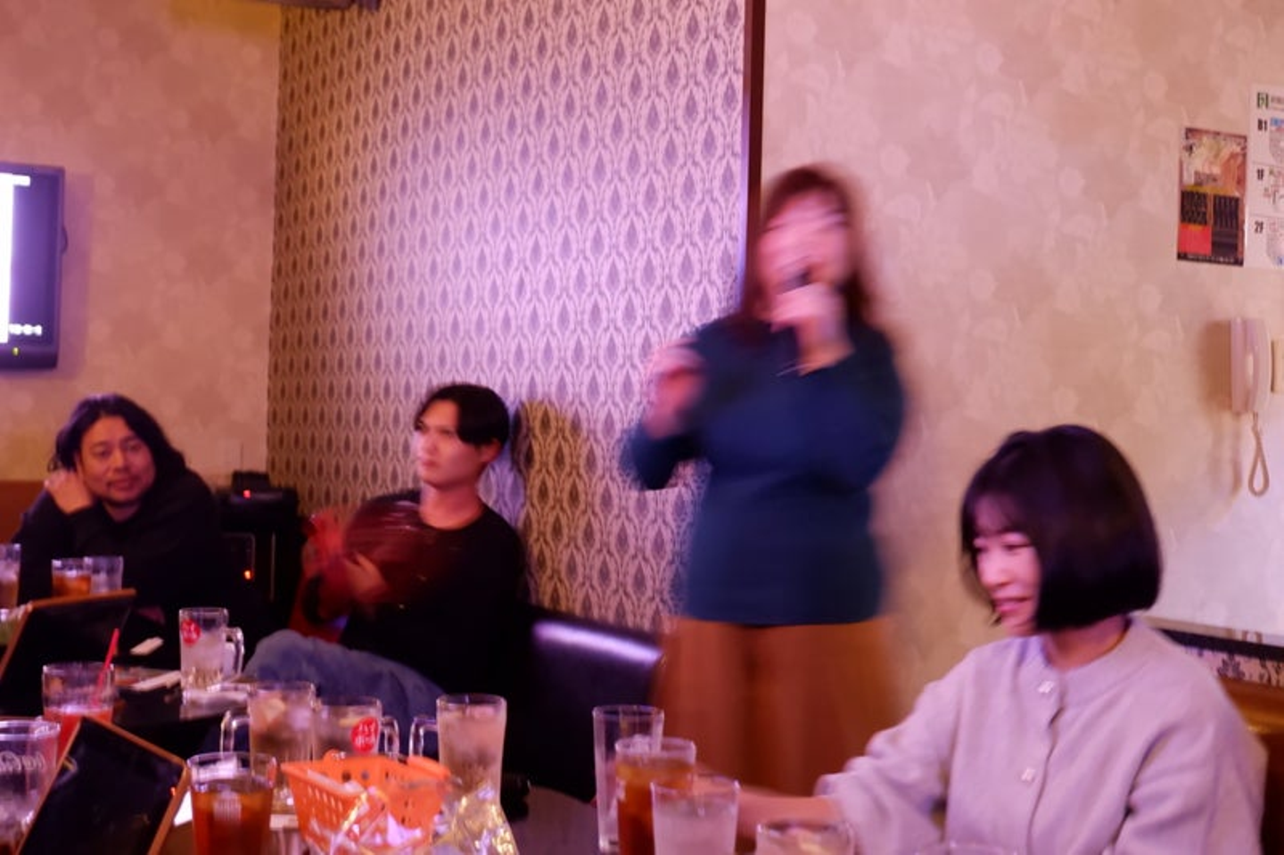 おいしい鉄板焼きをいただき、一行は二次会会場となる「カラオケ」に向かいます。