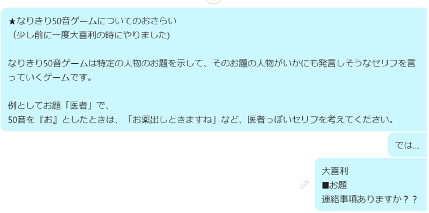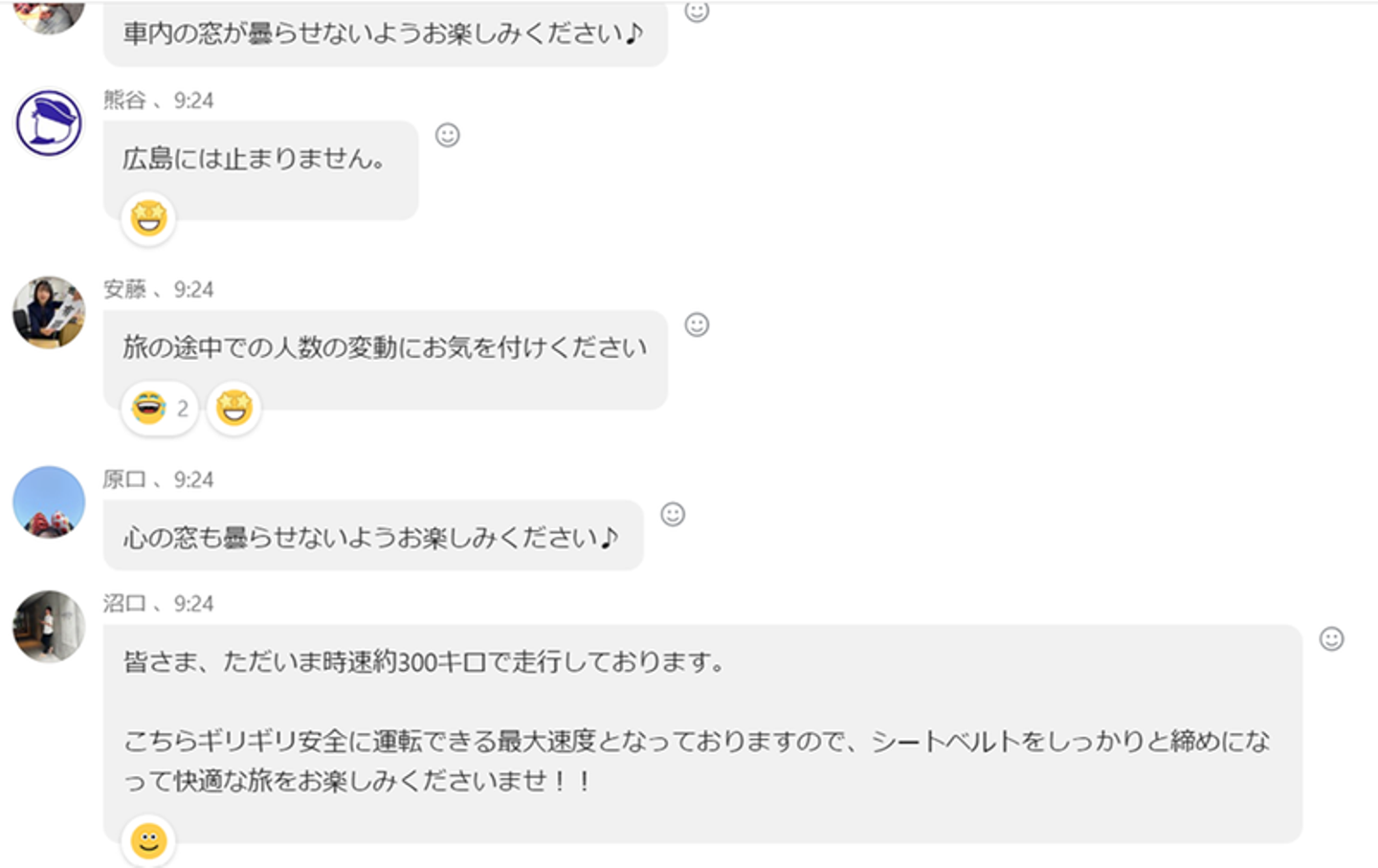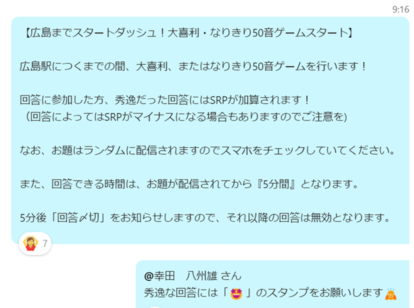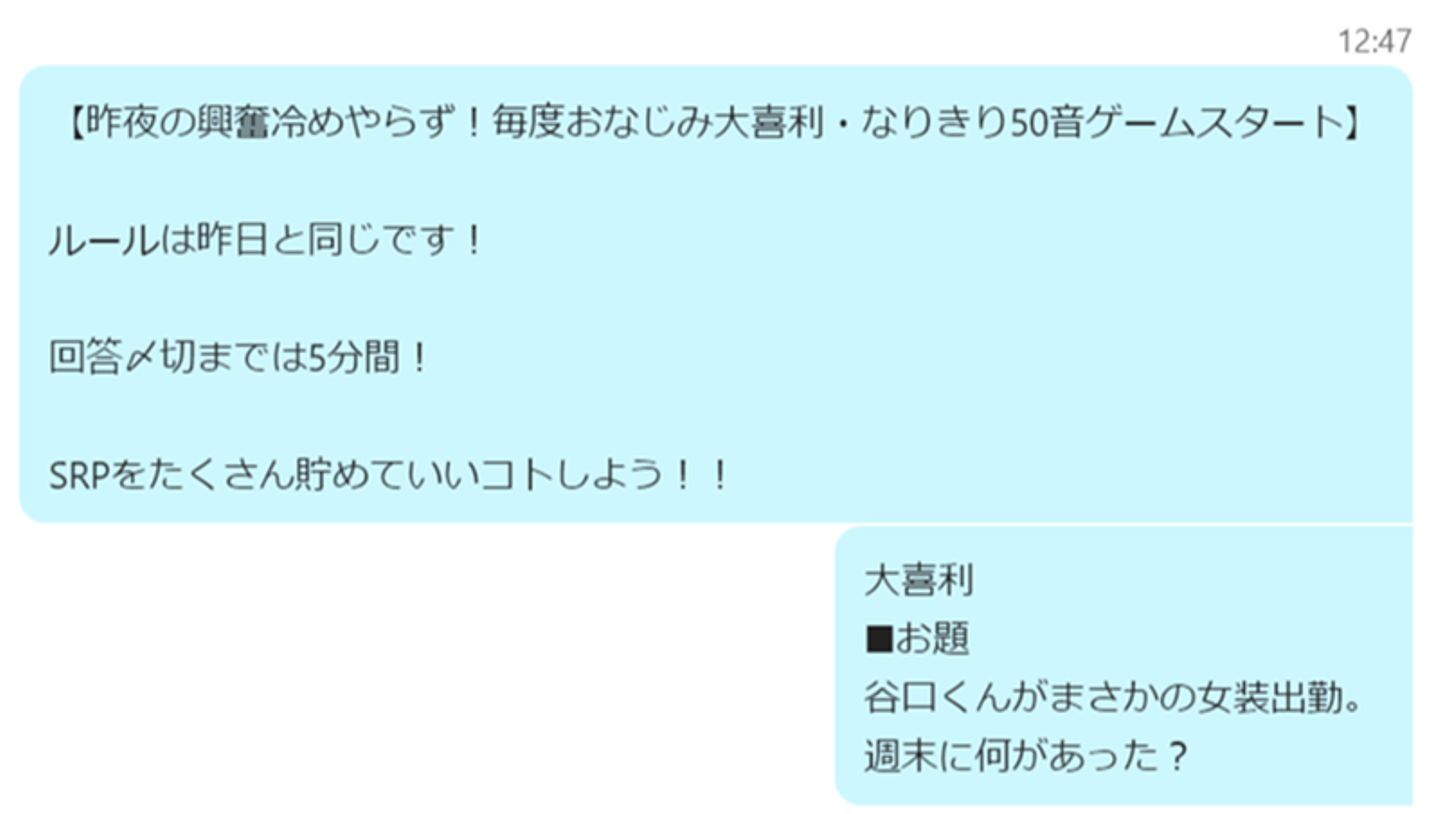 ※社員旅行専用スカイプより抜粋(スカイプでお題が発せられ、回答もメッセージで行います。)