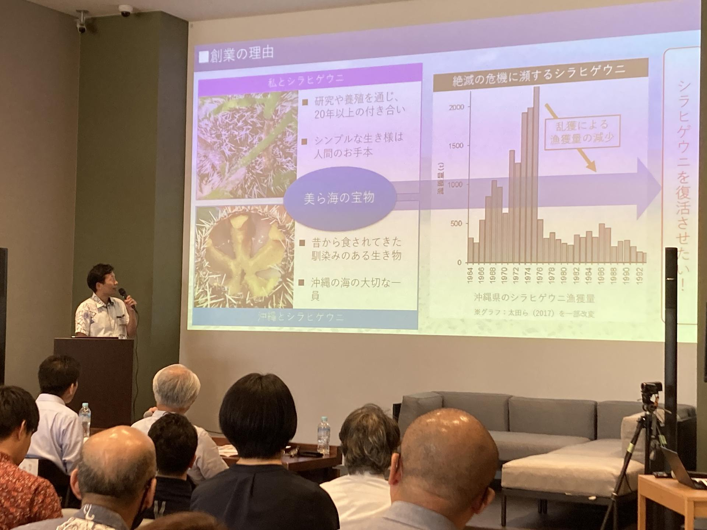 今回のイベントでは、前半は沖縄バイオコミュニティが支援するスタートアップや大学研究者がピッチし、その内容を当社代表の窪田とメンターの前田氏がコメントするという模擬メンタリングを実施。後半ではコロナ禍で途切れがちな支援者のネットワーキングの重要性をお話させて頂き、会場での参加者自己紹介、名刺交換のあと懇親会を実施し、多くの方との夜遅くまで交流させて頂きました。