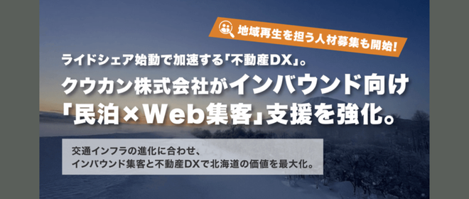 富良野・ニセコ――世界中の人々を惹きつけるこのエリアが、今、大きな転換期を迎えています。交通インフラの進化、インバウンド需要の回復。その変化をチャンスに変え、不動産とWebの力で地域価値を高める。それが、私たちクウカン株式会社の挑戦です。ライドシェア始動は「不動産DX」の追い風になる2024年末から始まる、富良野市の「日本版ライドシェア」。これまで課題だった“移動の不便さ”が改善され、観光客の行動範囲は大きく広がろうとしています。私たちはこの変化を、観光不動産の価値が再定義されるタイミングだと捉えています。アクセスがネックで埋もれていた物件、活用されていなかった空き家。それらを、民泊×W...