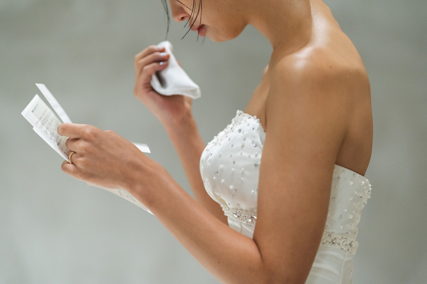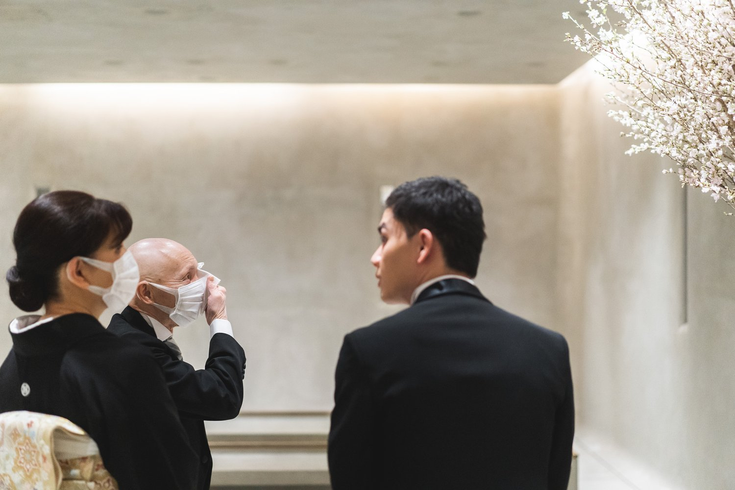 新郎のお父さんが体調不良で入院されているご家族の結婚式でした。お父さんは直前まで参列できるかわからない状態でしたが、当日参列できることを聞いて。体調が悪くて車椅子とかでいらっしゃるのかなと思っていたら、めちゃくちゃ元気だったんですよ。明るくてみんなに冗談を言ったりもしていて。式が始まる前に、新郎から両親に向けて書いた手紙を別の部屋で読む時間があるのですが、そのときも泣いたりしないんですよ。ほんと明るいお父さんだなぁと思って撮影していたんですね。