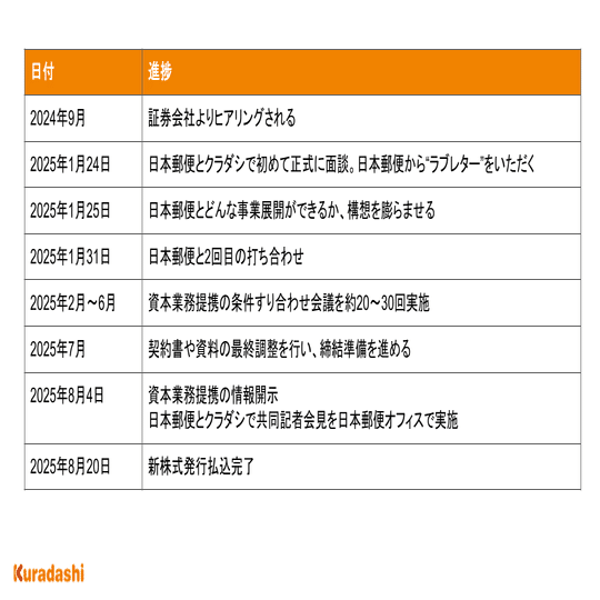 2025年8月4日、クラダシは日本郵便株式会社(以下「日本郵便」)と資本業務提携を締結しました。