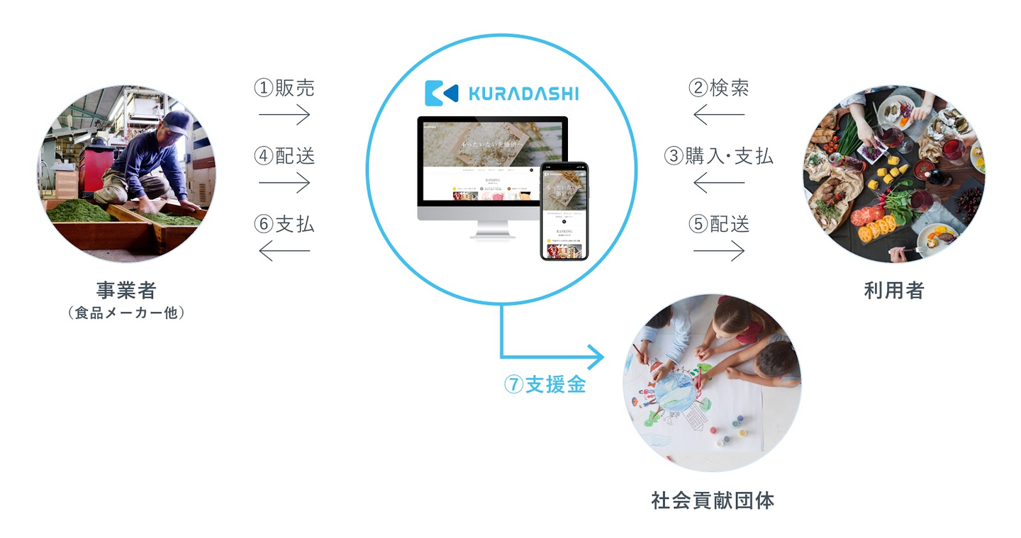 KURADASHI(https://www.kuradashi.jp/)は、フードロス削減への賛同メーカーより協賛価格で提供を受けた商品を最大97%OFFで消費者(会員)へ販売し、売り上げの一部を社会貢献活動団体へと寄付する日本初・最大級の社会貢献型ショッピングサイトです。環境保護や動物保護の団体、新たに設立したKURADASHI基金など、全19団体を支援しています。