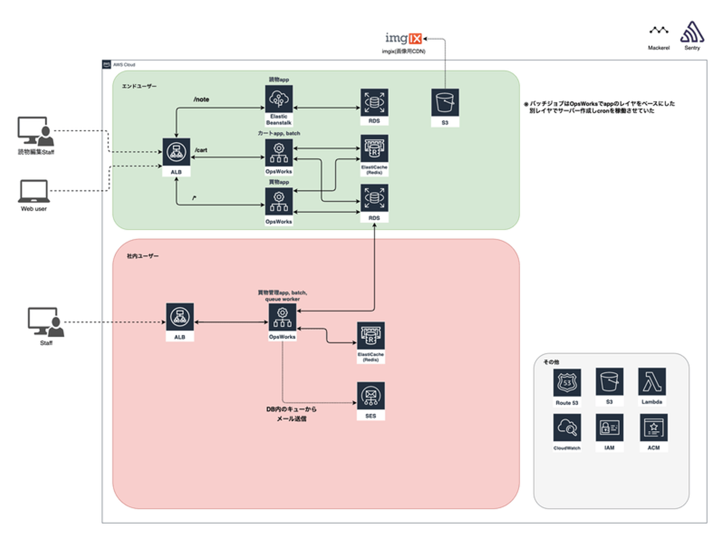 買い物appはOpsWorksでEC2をプロビジョニングしているところや、RDS、SES、S3といったAWSサービスを使用しているところは以前と変わっていません。差分は以下になります。