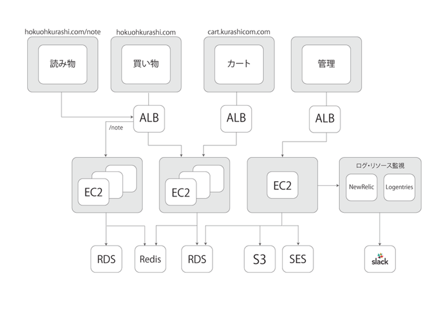 いきなりイベント中に触れなかった内容ではありますが、これはクラシコム内でSREの活動が始まるずっと前に書かれた記事にある構成図です。