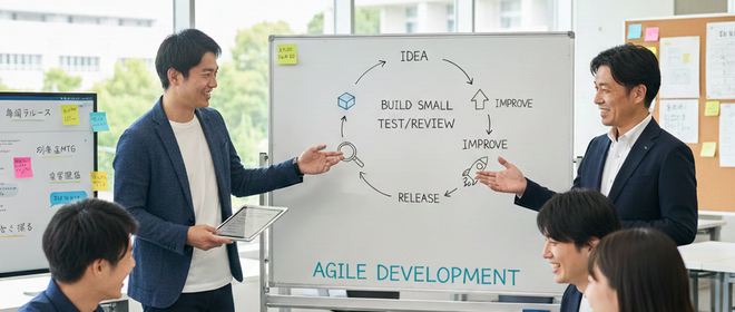 市場変化に合わせて顧客サービスや業務課題の解決を進めています。そのため、柔軟に業務システムを改善できるようアジャイル開発を推進しています。