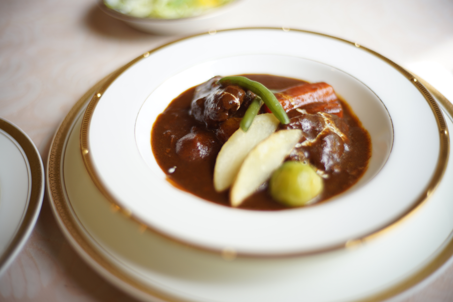 看板メニューのビーフシチューを食します。栃木牛をはじめとした地元の食材を使ったシチューは美味。写真はないのですが、中禅寺湖で採れたニジマスの塩焼きも最高でした。