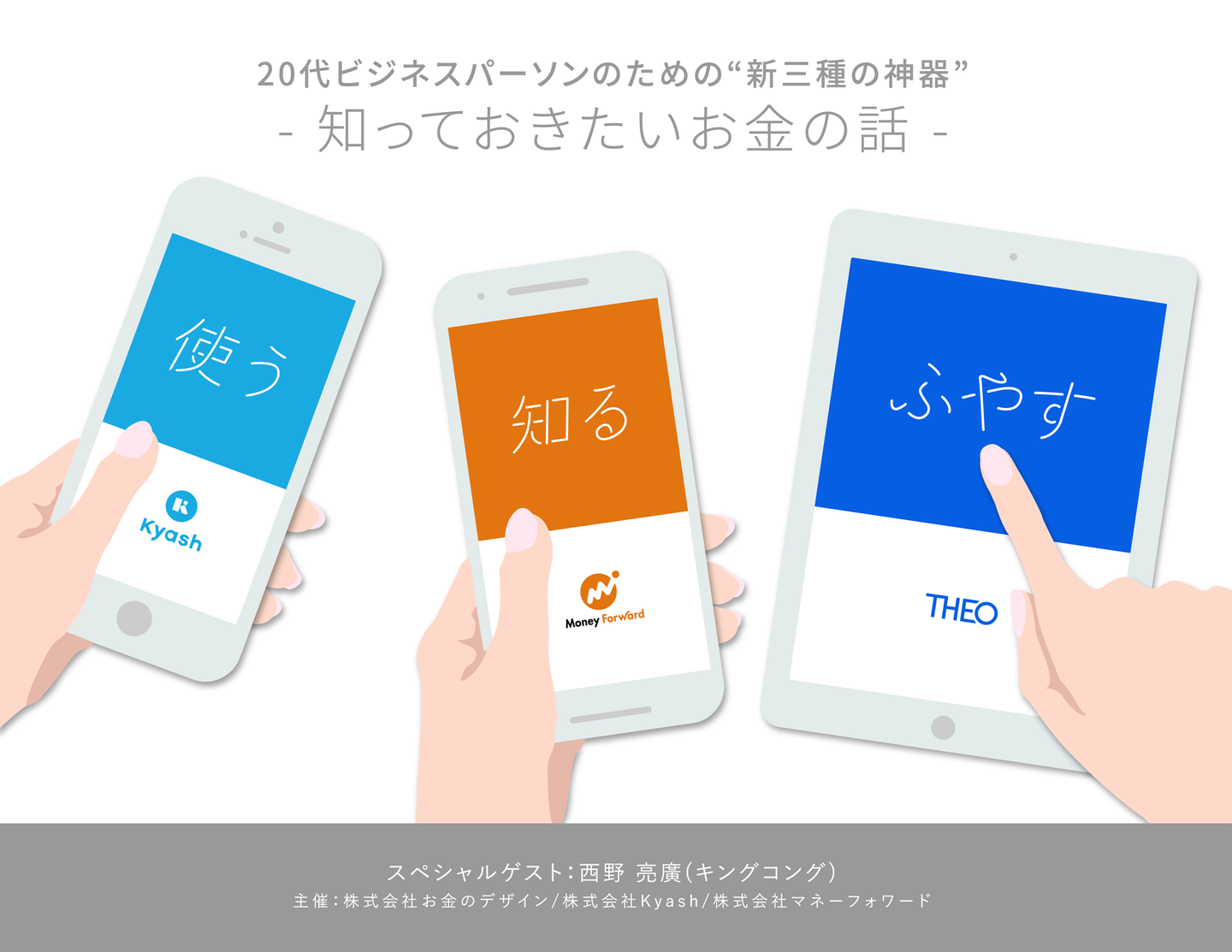 ▼今回のイベントでは、キングコング西野さんのトークショーと共に、お金の「新三種の神器」として以下3つのサービスが紹介されました。(使う:Kyash/知る:マネーフォワード/ふやす:THEO)